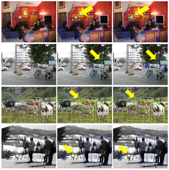 To visually illustrate the performance of the enhanced BFRDNetV2 model, we conduct visual comparative analyses using the COCO dataset, displayed the results in Figure 12. Although the COCO dataset is not specifically composed of UAV-captured images, the comparative outcomes vividly highlight BFRDNetV2’s superior capability in identifying small targets. Although BFRDNetV2 does not achieve perfect detection of all targets, it shows significantly improved accuracy.