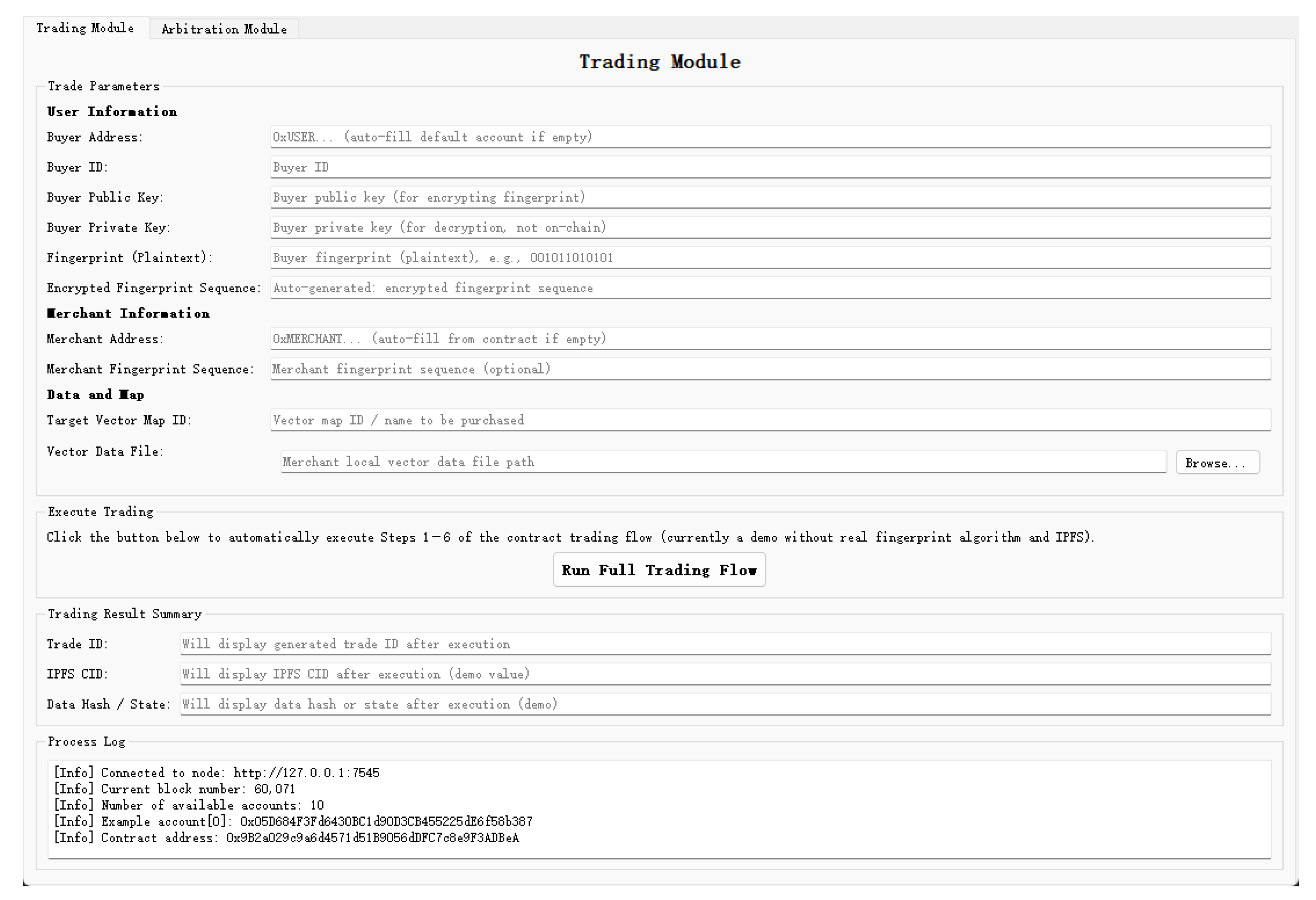 - A blockchain-enabled smart contract framework is developed to integrate fingerprint binding, data delivery, and automated dispute arbitration into a unified execution process. By embedding responsibility attribution logic directly into smart contracts, the proposed framework provides tamper-resistant, transparent, and third-party-free copyright protection for vector geographic data transactions.