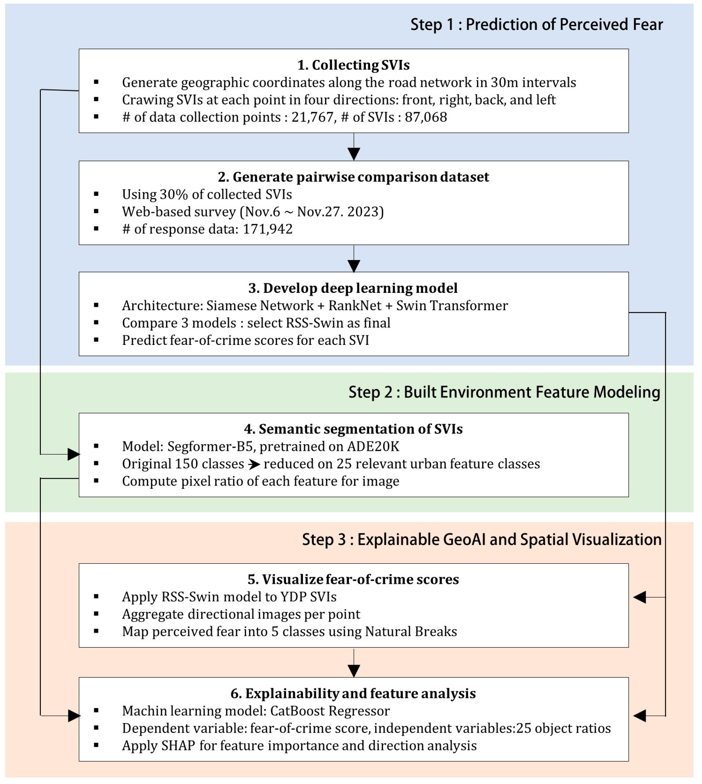 Figure 1). With industrial, residential, and commercial functions coexisting within compact urban blocks, Yeongdeungpo-gu provides heterogeneous contexts that are well-suited for street-level, perception-based safety modeling. The study was structured as a three-step GeoAI workflow encompassing prediction, feature modeling, and explainable interpretation (