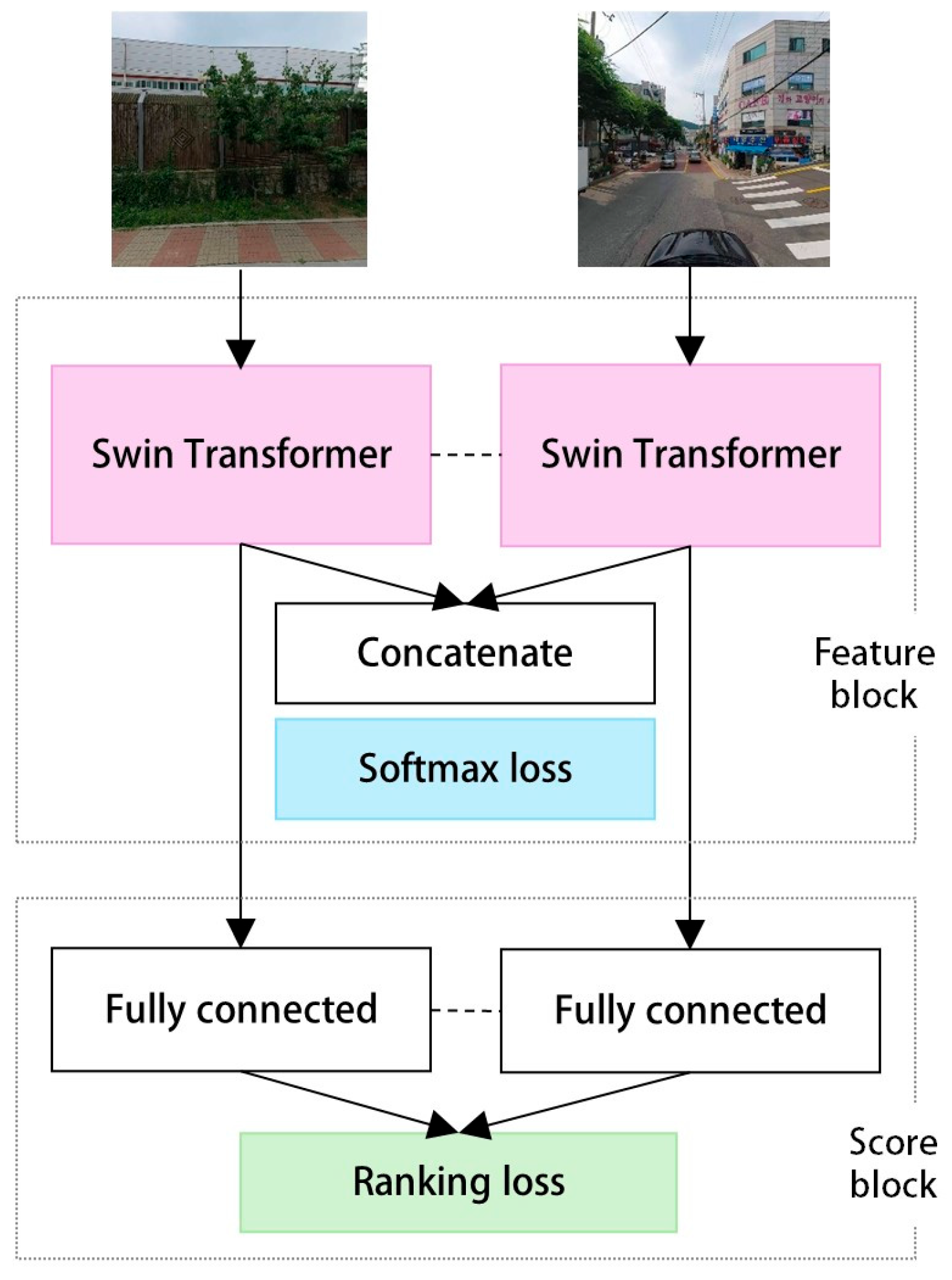 42]), and local patch models. (2) RSS-ViT—a Siamese + RankNet framework using a Vision Transformer (ViT) backbone (vit_base_patch16_224), pre-trained on ImageNet-1k via the TIMM library. ViT is recognized as the first Transformer-based architecture to successfully apply self-attention to image classification. (3) RSS-Swin (proposed)—also built on the Siamese + RankNet framework but replacing the backbone with a Swin Transformer (swin_base_patch4_window7_224), pre-trained on ImageNet-1k. The Swin Transformer effectively handles high-resolution images with hierarchical and window-shifting attention, enabling robust spatial representation. Model training was performed on Amazon Web Services (AWS) using a g4dn.12xlarge instance (four NVIDIA T4 GPUs, 48 vCPUs, 900 GB NVMe SSD, Ubuntu 18.04.1). Of the total pairwise dataset, 80% (137,552 pairs) was used for training and 20% (34,390 pairs) for testing. Model accuracy was computed as the proportion of test pairs whose predicted ranking order matched the ground-truth label.