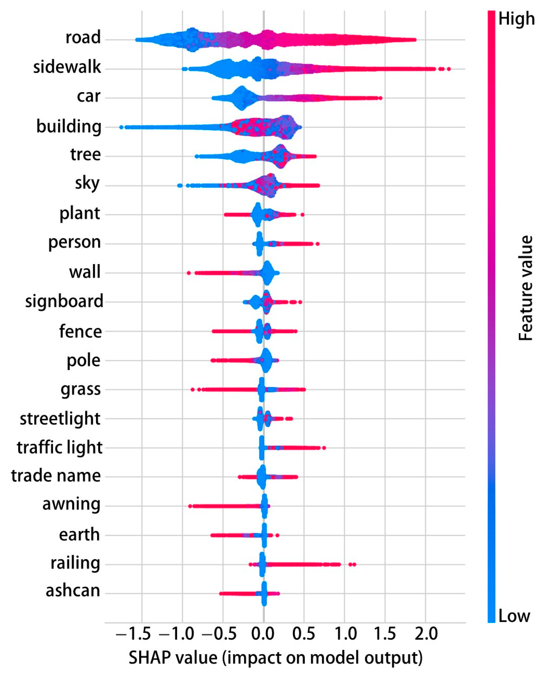 Figure 11 shows the SHAP summary plot, which visualizes the distribution of SHAP values across all data points. Features are ordered by their overall importance, while the color of each point indicates the relative pixel proportion of that object in the SVI—red representing higher ratios and blue indicating lower ones. The horizontal position of each point shows both the magnitude and direction of influence: points located to the right of the centerline contribute to lower perceived fear of crime (i.e., greater perceived safety), whereas points to the left are associated with higher perceived fear. This interpretation aligns with the directionality of the model output, where higher predicted scores correspond to a reduced sense of fear.