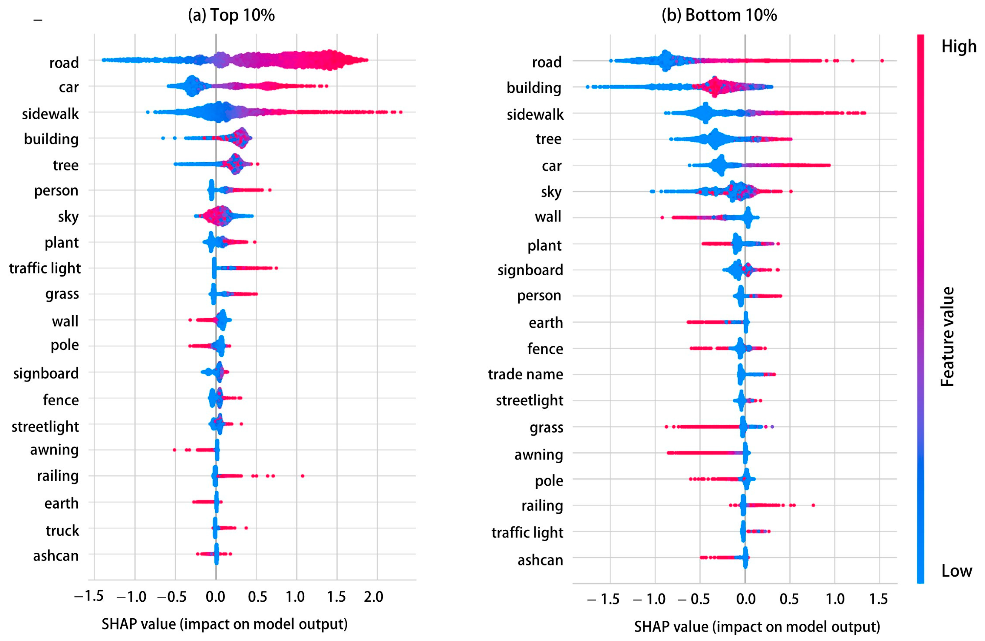Figure 13a,b present the corresponding SHAP value distributions for both groups, highlighting the relative contribution of each streetscape feature. Across both deciles, road, sidewalk, car, and person consistently exhibited negative SHAP values for fear (i.e., safety-enhancing effects), whereas wall, earth, pole, awning, and ashcan were associated with elevated fear when their proportions increased. These findings reaffirm the dominant role of openness, accessibility, and human activity in mitigating perceived fear.