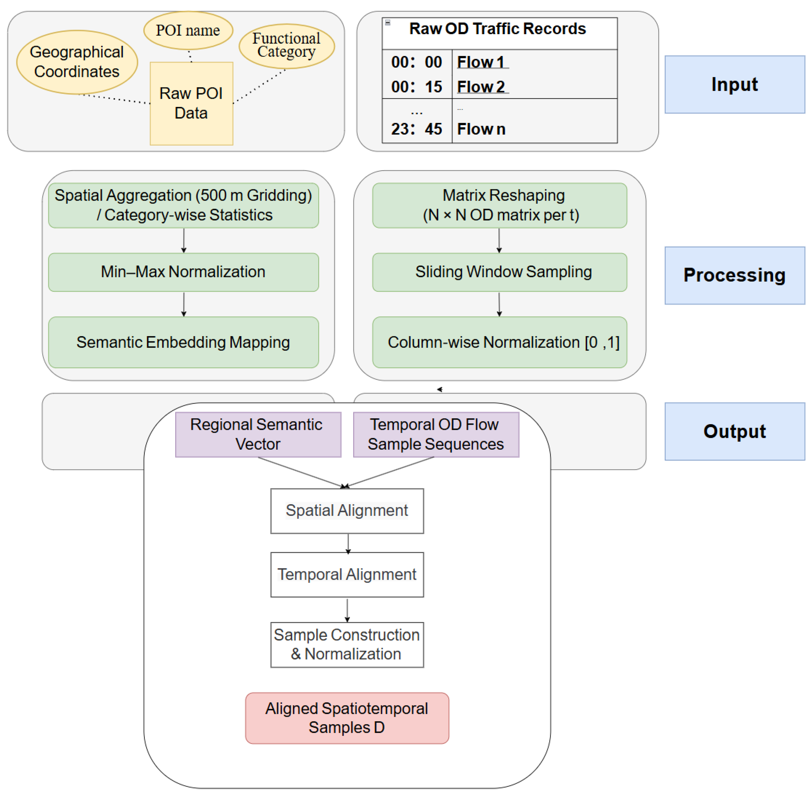 After deriving the POI-based semantic representations and constructing the OD flow matrices, multi-source data are aligned across spatial and temporal dimensions to guarantee feature synchronization for model training. The aligned data are then organized into spatiotemporal sample sets that can be directly fed into the predictive framework.
