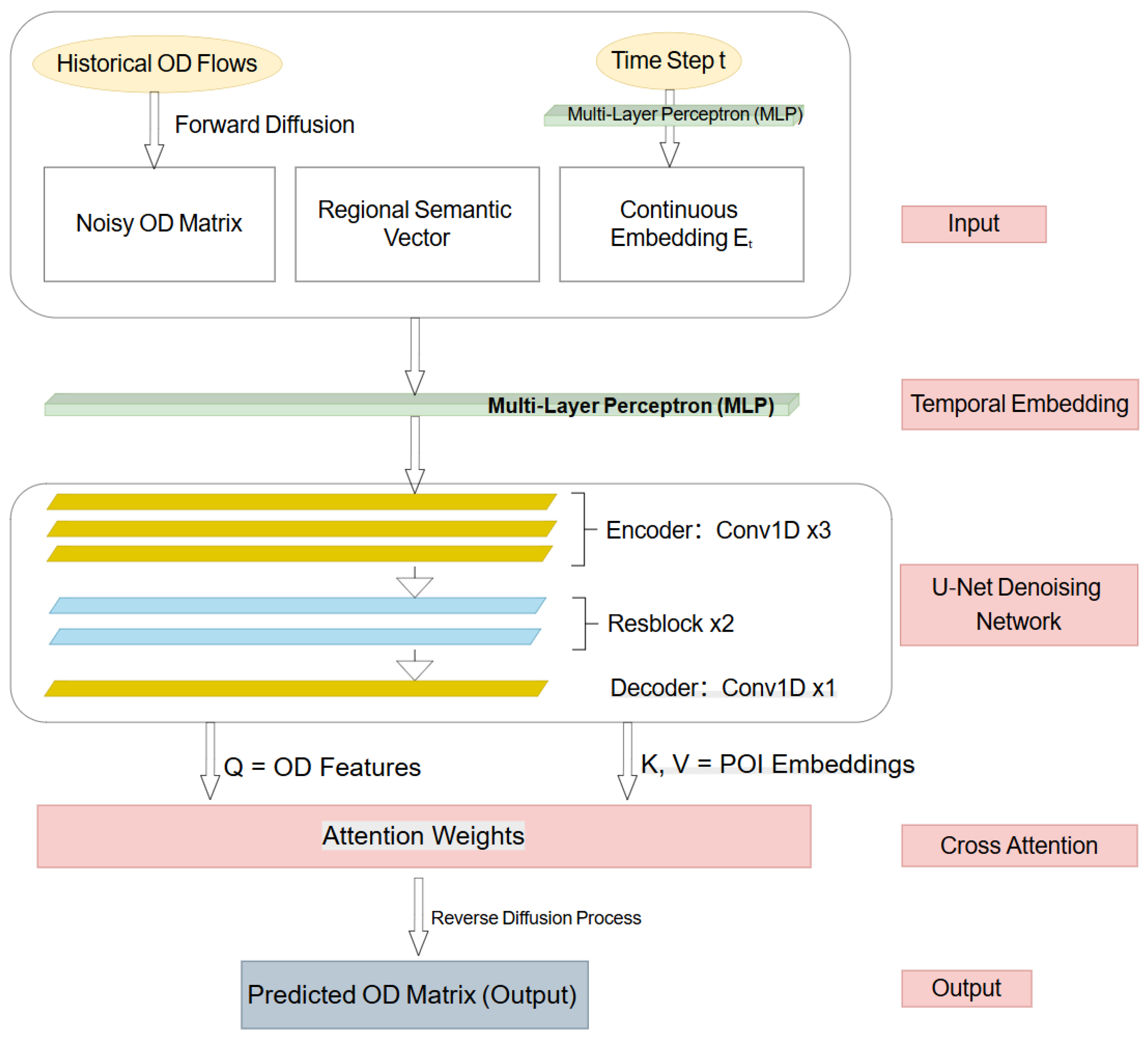 To address these challenges, we propose a Cross-Attention Diffusion Model for short-term OD flow prediction. Built upon the generative diffusion framework, Cross-Attention Diffusion Model (CADM) introduces semantic conditioning by incorporating POI embeddings into the noise modeling process, enabling external knowledge–guided generation control. Specifically, the model takes noisy OD features and the diffusion time step t as primary inputs, while using POI embedding vectors as spatial semantic conditions. On this basis, a Cross-Attention Module is designed to achieve bidirectional fusion between semantic and spatiotemporal representations. In this mechanism, OD spatiotemporal features serve as queries (Q), and POI embeddings act as keys (K) and values (V). Through attention-based weighting, the model dynamically captures semantic relevance, allowing it to focus on semantically related regions at each diffusion step and thereby perform semantically guided noise prediction.