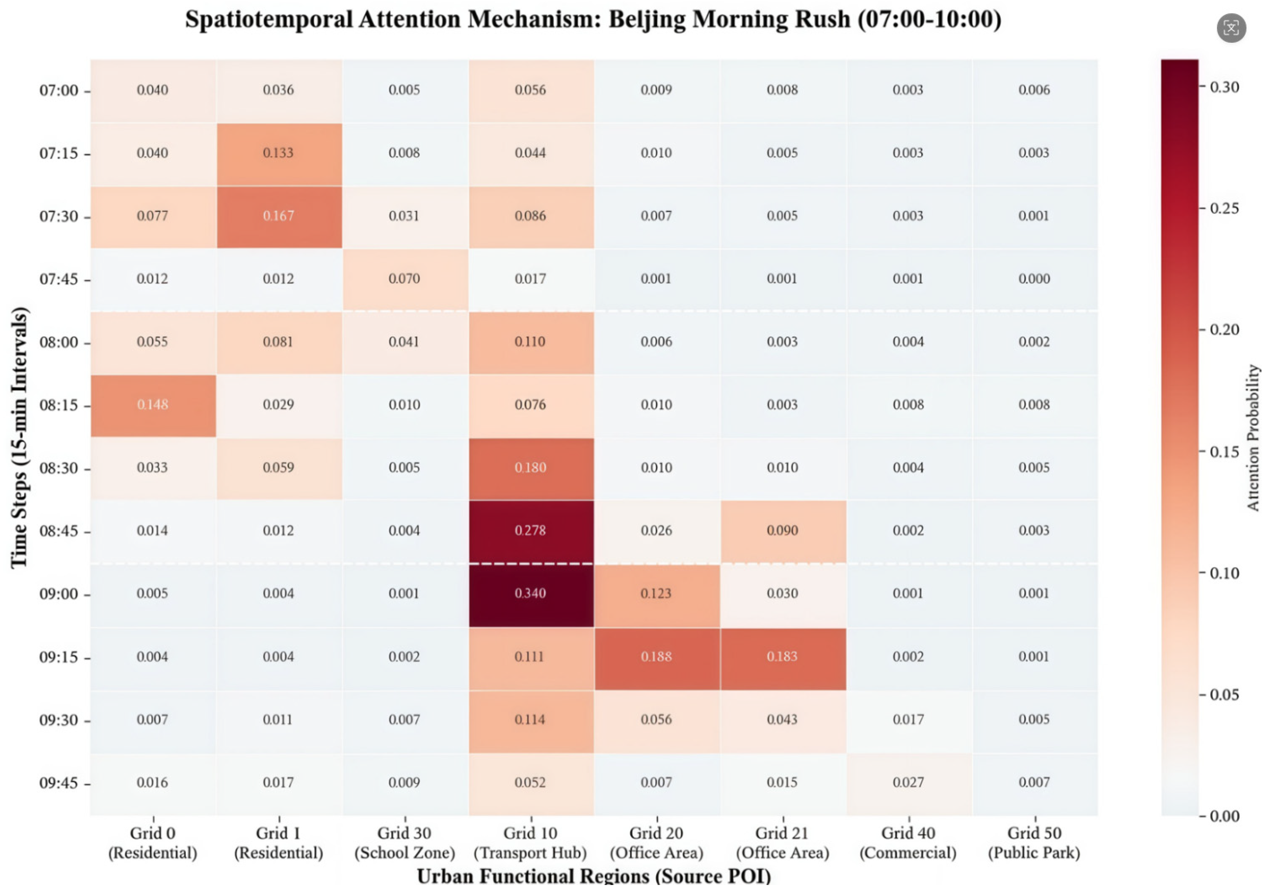 Figure 5 visualizes the learned spatiotemporal attention patterns during Beijing’s morning rush hour (07:00–10:00). The heatmap reveals three key characteristics of the model’s semantic awareness.