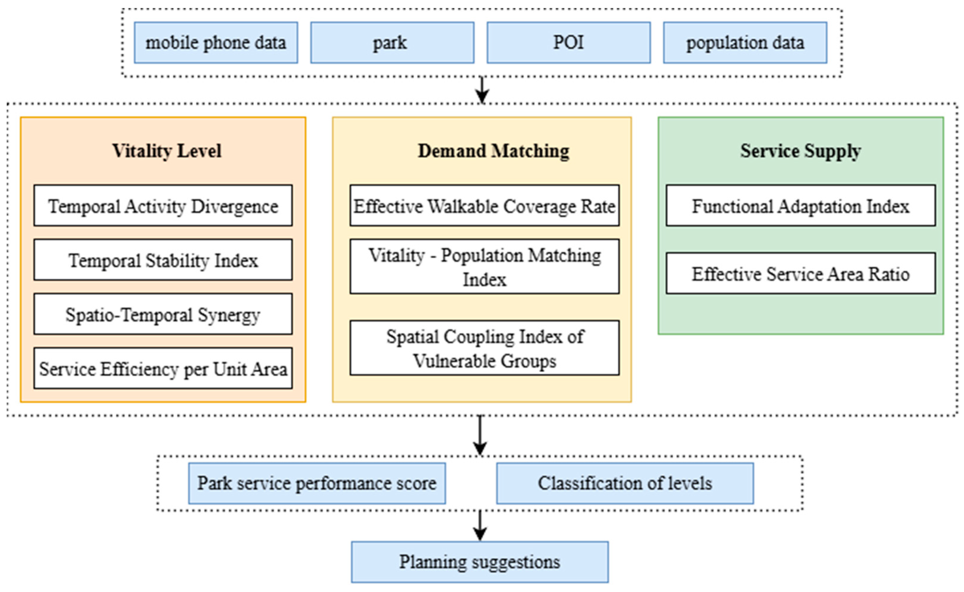 | Service Efficiency per Unit Area (SEUA) | Activity heat index/Green area (people/hectare/hour) | remote sensing image data | |