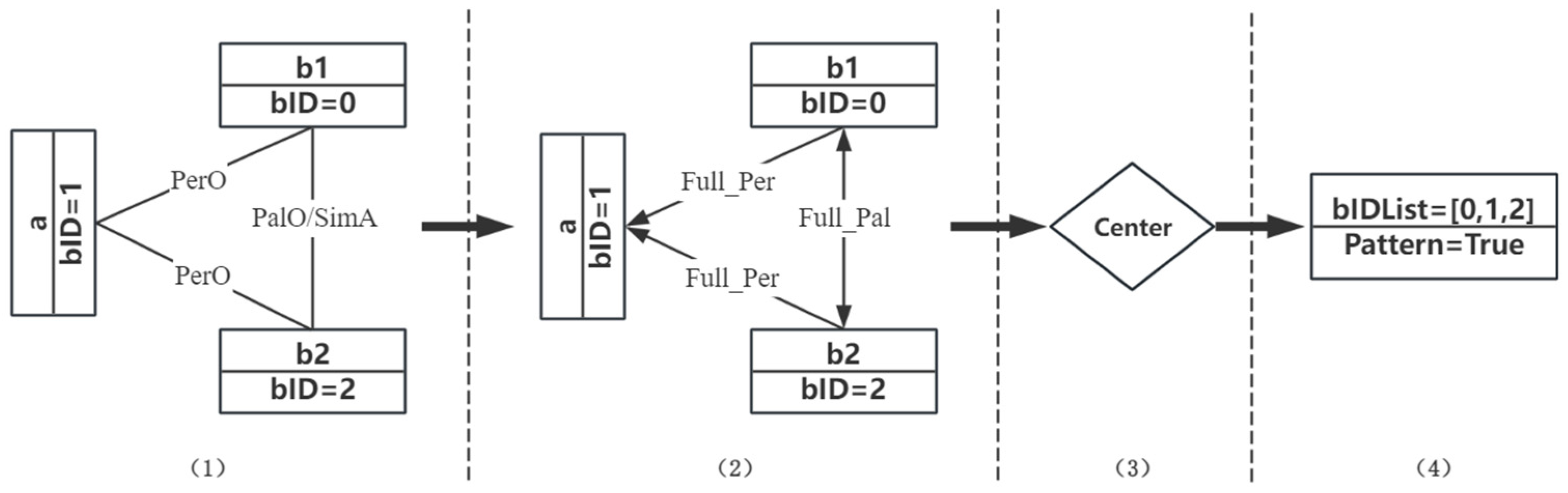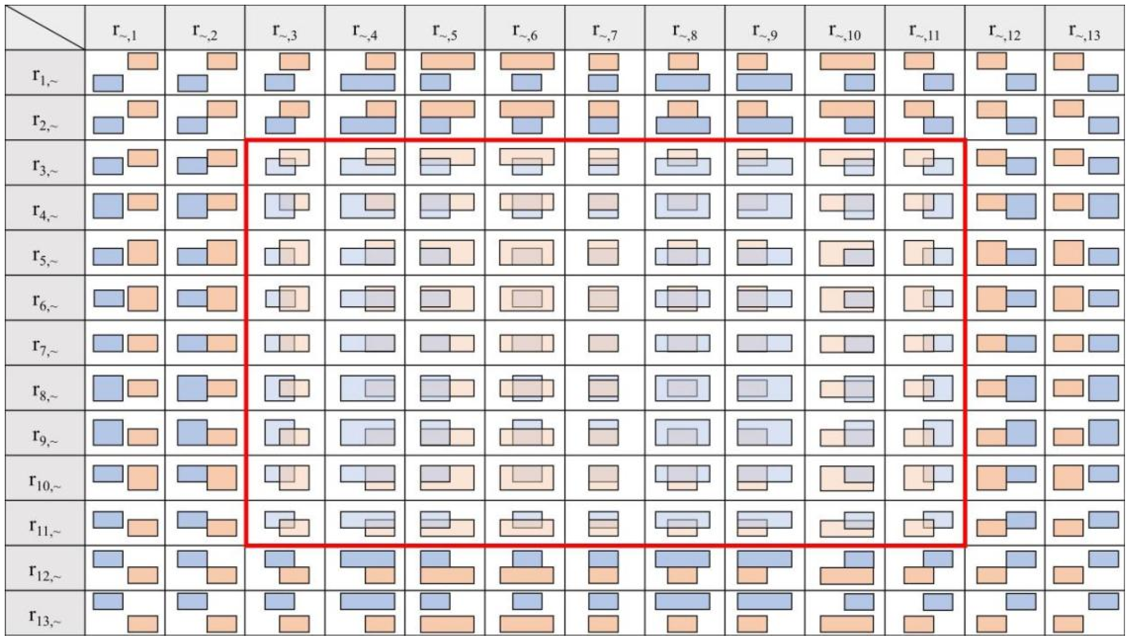 When SBRb is projected onto the long or short axis of SBRa, their spatial relationship can be characterized using 13 fundamental relative positions. These relations include before, meets, overlaps, starts, during, finishes, equal, and their corresponding inverse relations, forming a set of 13 mutually exclusive and jointly exhaustive spatial relations. In this study, these relations are adopted to discretize and model the relative positional relationships between building entities, thereby facilitating rule-based reasoning within the knowledge graph. Given that SBRb may overlap projections on both SBRa’s long and short axes, the relative positions between the two can be denoted as r