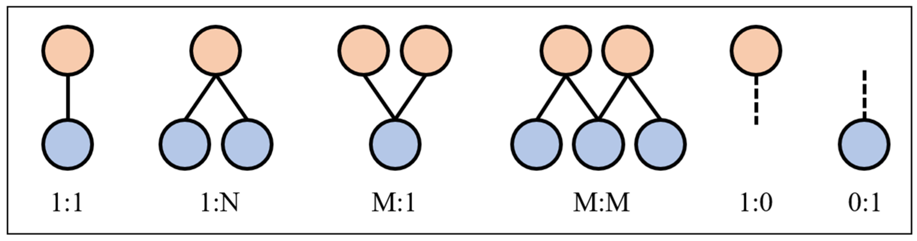 1]. Such changes can lead to substantial discrepancies in the shape and size of the same building on different scales, or result in its absence on a smaller scale. To address this, this study defines six matching relationships to associate the same building entities across scales: one-to-one (1:1), one-to-many (1:M), many-to-one (M:1), many-to-many (M:M), one-to-none (1:0), and none-to-one (0:1), as detailed in