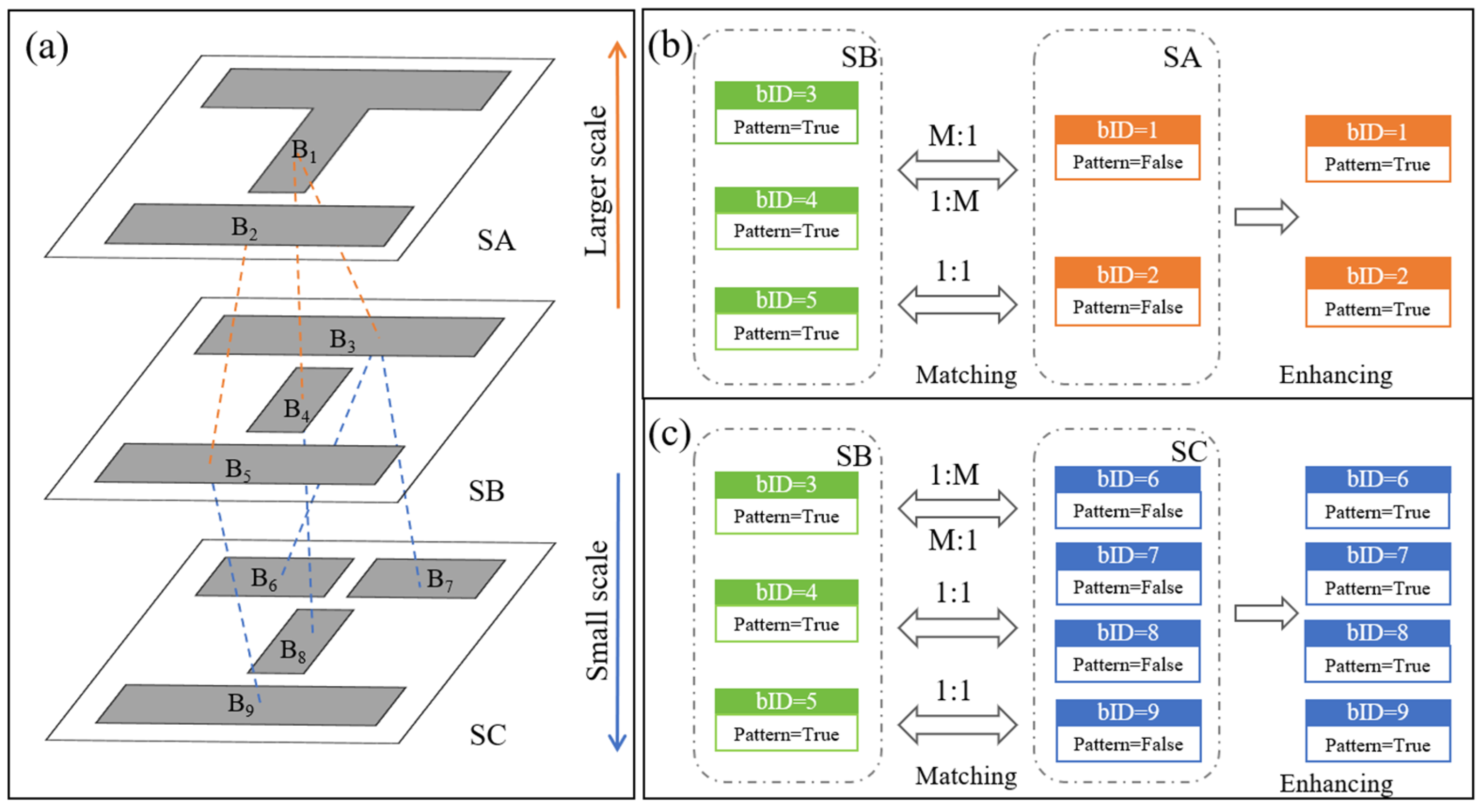 Research into enhancing pattern recognition with multi-scale data encompasses two primary strategies. The first strategy involves transitioning from larger to smaller scales, essentially treating groups of buildings at larger scales as decomposed into their component structures at smaller scales. For instance, a building or group of buildings identified with an I-shaped pattern at a larger scale may suggest the potential for similar patterns among corresponding smaller-scale buildings [