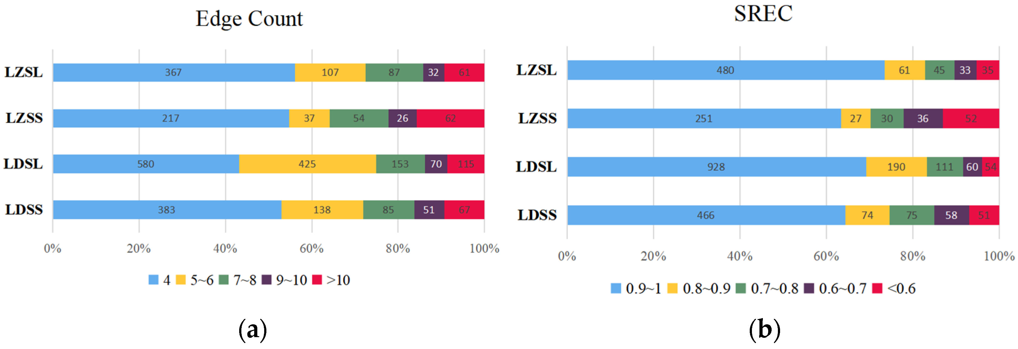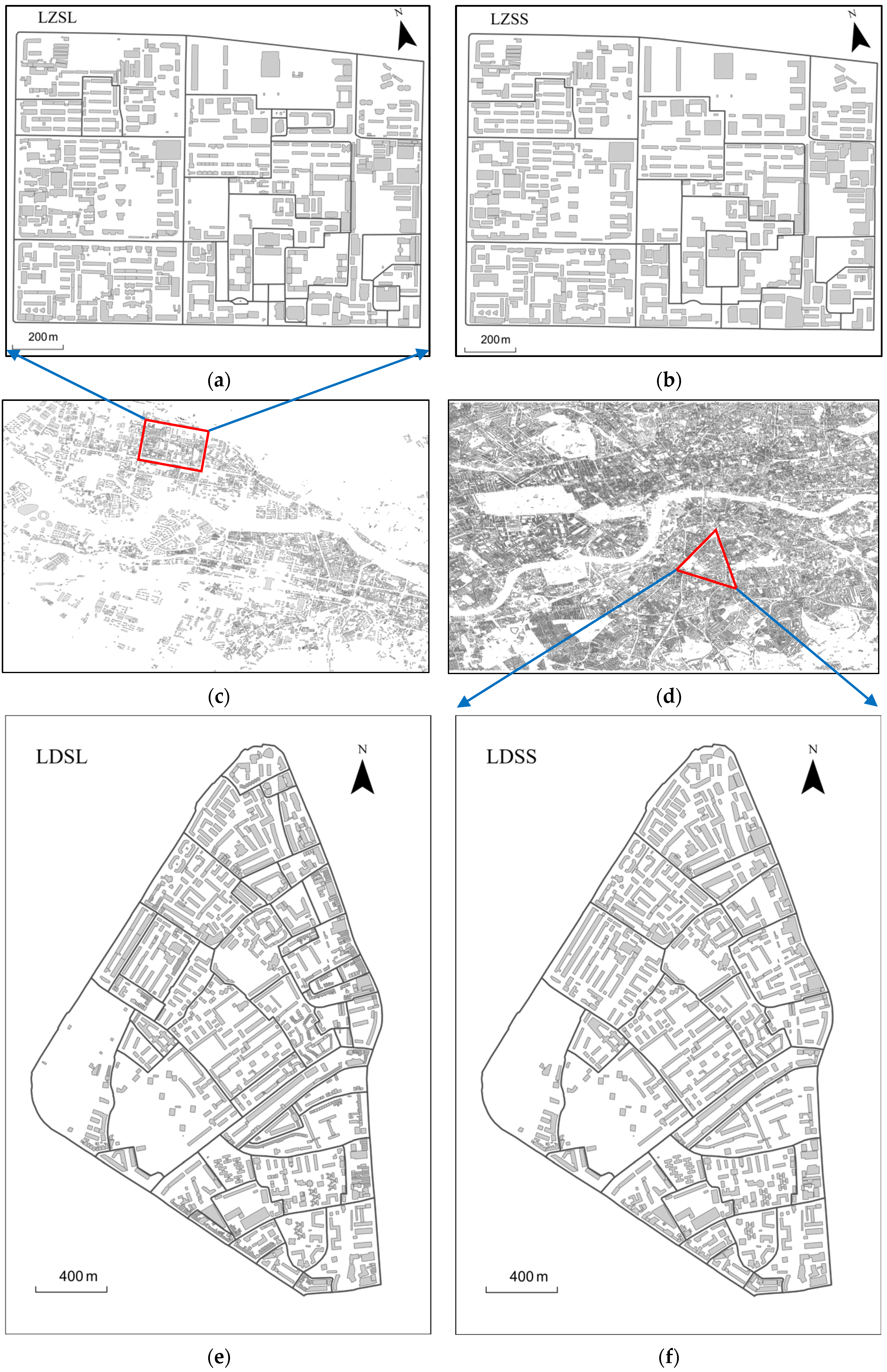 Figure 8.The selected datasets are categorized into two scale levels, which correspond to two spatial resolutions: large-scale data (SL) at approximately 1:5000 and small-scale data (SS) at approximately 1:10,000. The dataset from Lanzhou encompasses about 2 square kilometers and includes 654 buildings at the larger scale and 395 at the smaller scale. Conversely, the London dataset covers about 1.6 square kilometers and comprises 1343 buildings at the larger scale and 724 at the smaller scale. These datasets provide a comprehensive basis for evaluating the method’s effectiveness in identifying Building patterns within significantly varied urban settings.