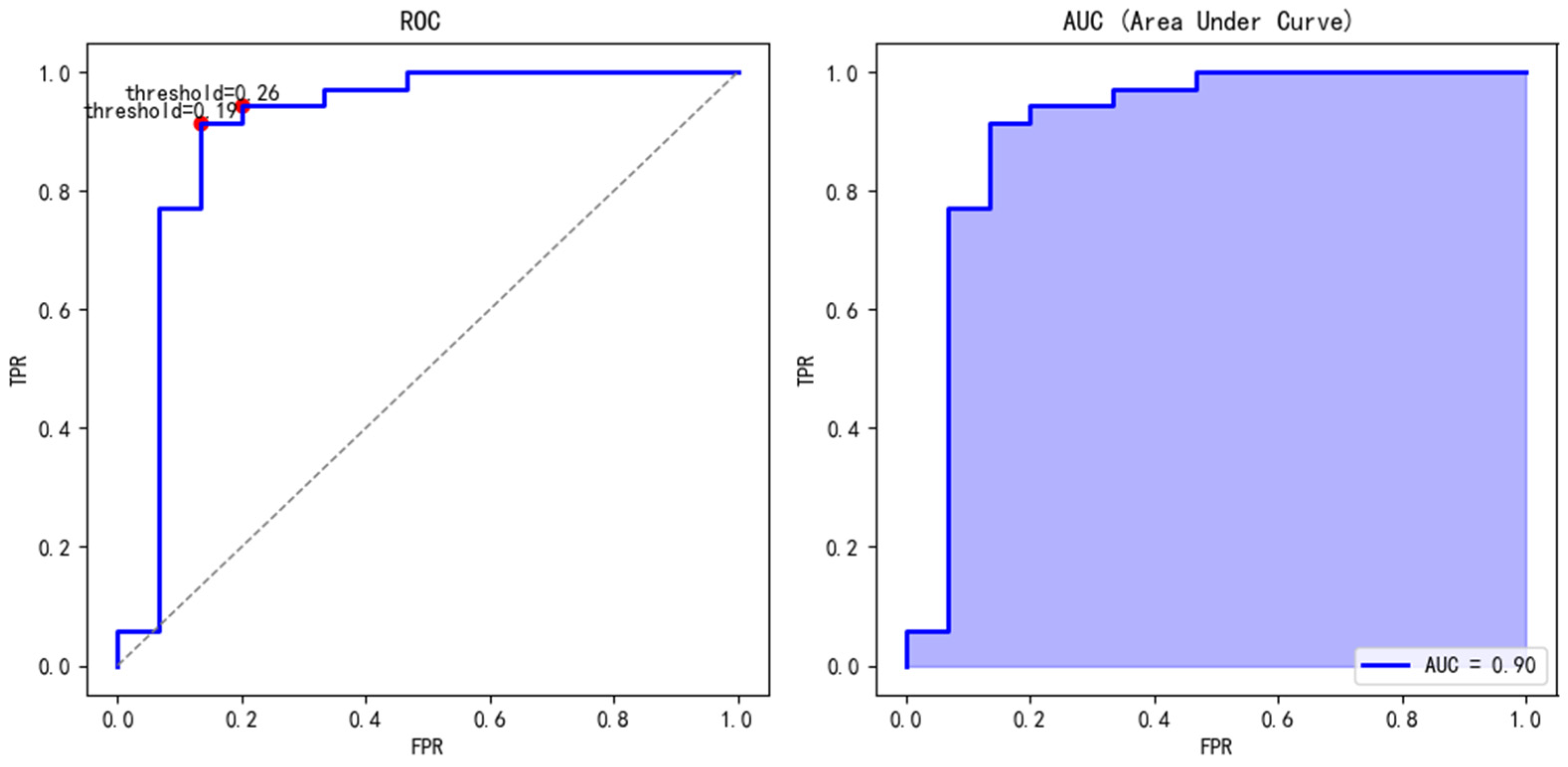 At the same time, in order to define the center distance constraint, the performance of the model at different center distance thresholds is evaluated using the ROC-AUC metric under the three threshold settings mentioned above. A set of 100 threshold values ranging from 0 to 1 with a step size of 0.01 is used, and the ROC-AUC curve is plotted, as shown in