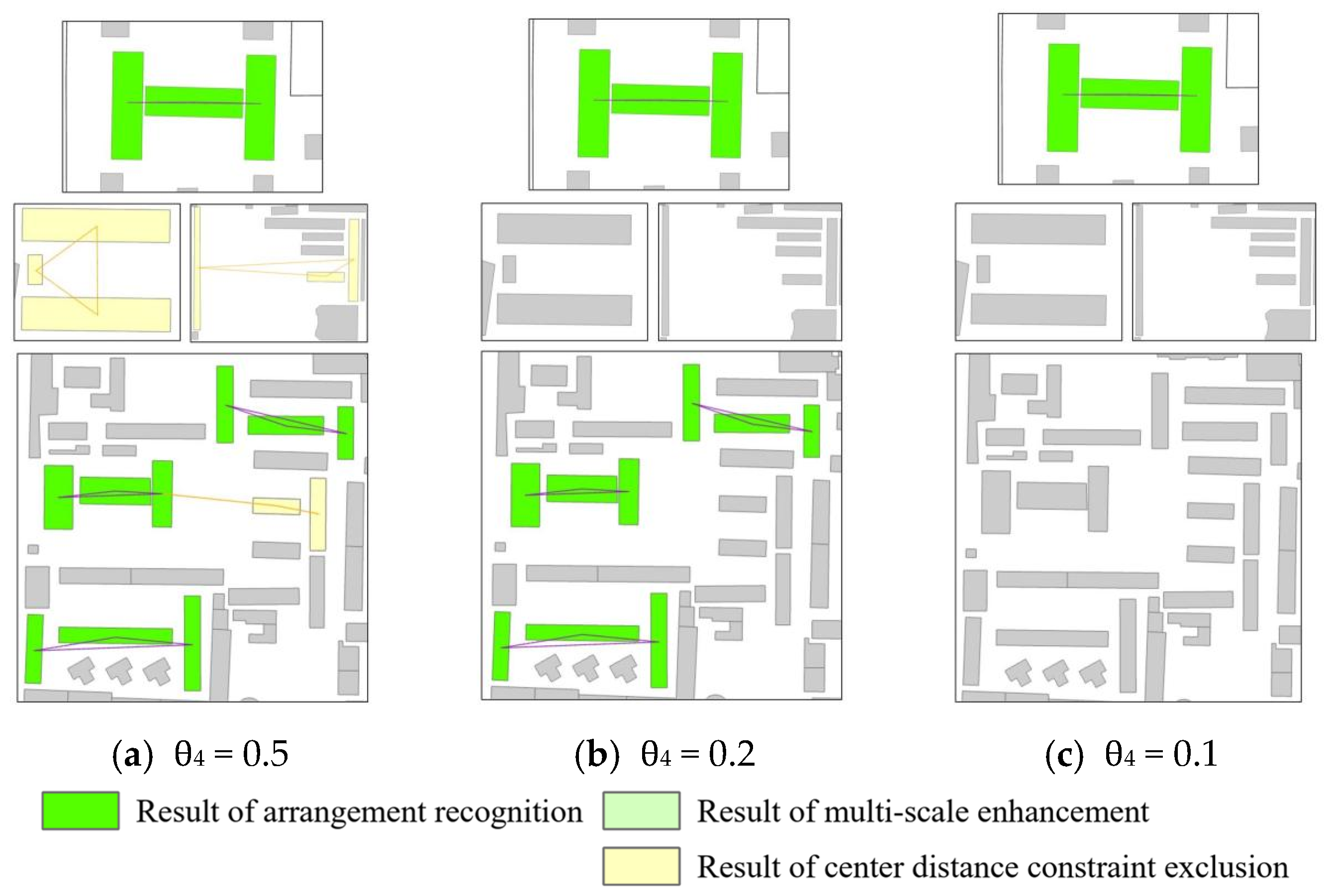 The building pattern recognition methodology employed in this study is based on Gestalt principles, with visual variables such as position, shape, size, orientation, and center distance. Variations in the threshold values of these parameters will influence the recognition results differently. As defined in