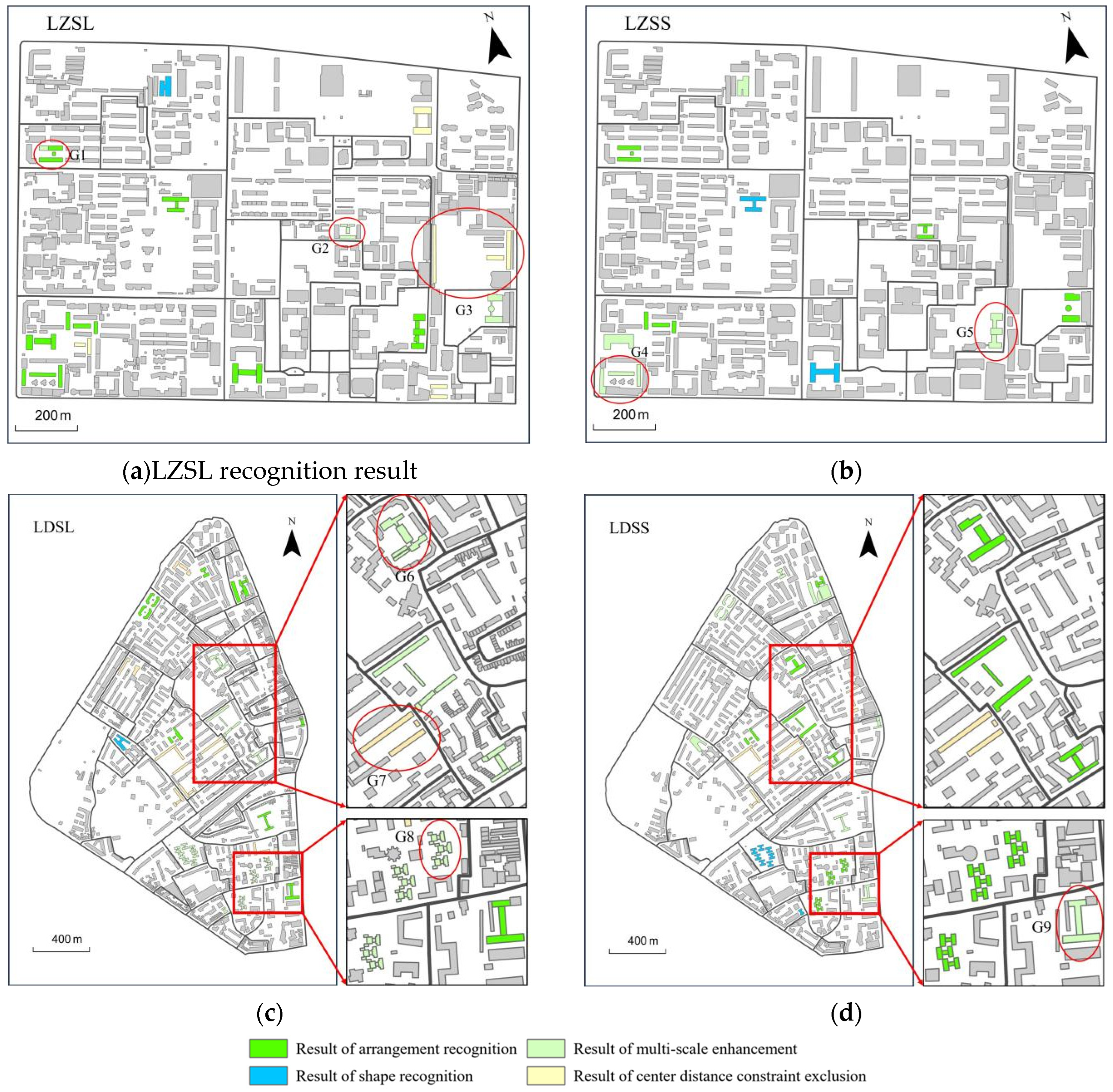 To assess the efficacy of the proposed method, outcomes are analyzed across four scenarios: (1) Results from recognizing individual building shapes and their arrangements (SR + AR); (2) Integrated analysis including shape recognition, arrangement assessment, and center distance evaluation (SR + AR + CR); (3) Comprehensive analysis incorporating shape recognition, arrangement determination, and multi-scale enhancement (SR + AR + ER); (4) A full suite of analyses combining shape recognition, arrangement verification, center distance checks, and multi-scale enhancement (SR + AR + CR + ER).
