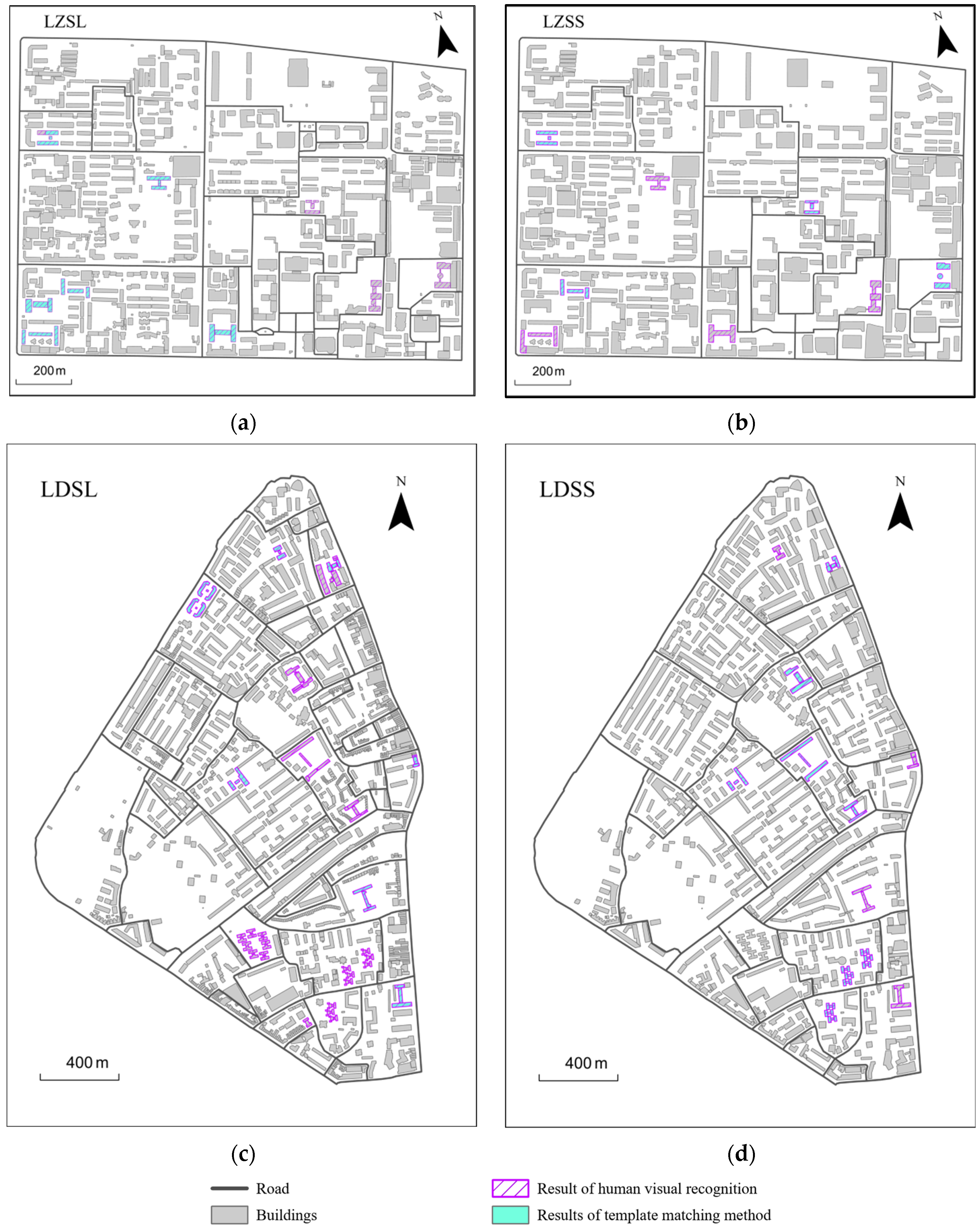In addition, comparative experiments were conducted on the same dataset using the template matching method (TM) simultaneously. The TM follows the canonical definition of I-shaped building patterns reported in the literature [