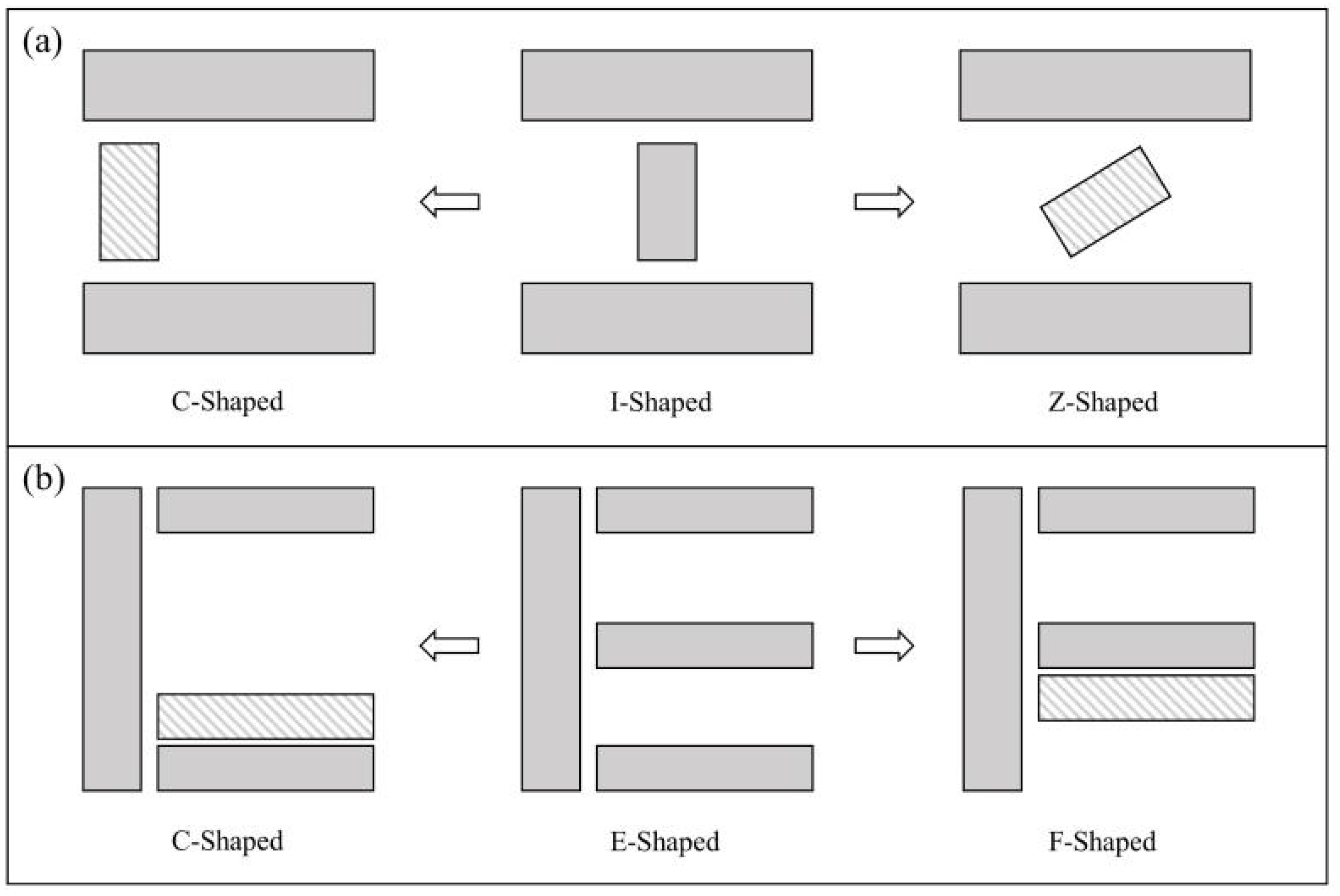 14], it more closely resembles a C-shaped pattern visually. Conversely, a deviation in the central building’s orientation on the right side results in a Z-shaped pattern. Similarly, the E-shaped pattern in