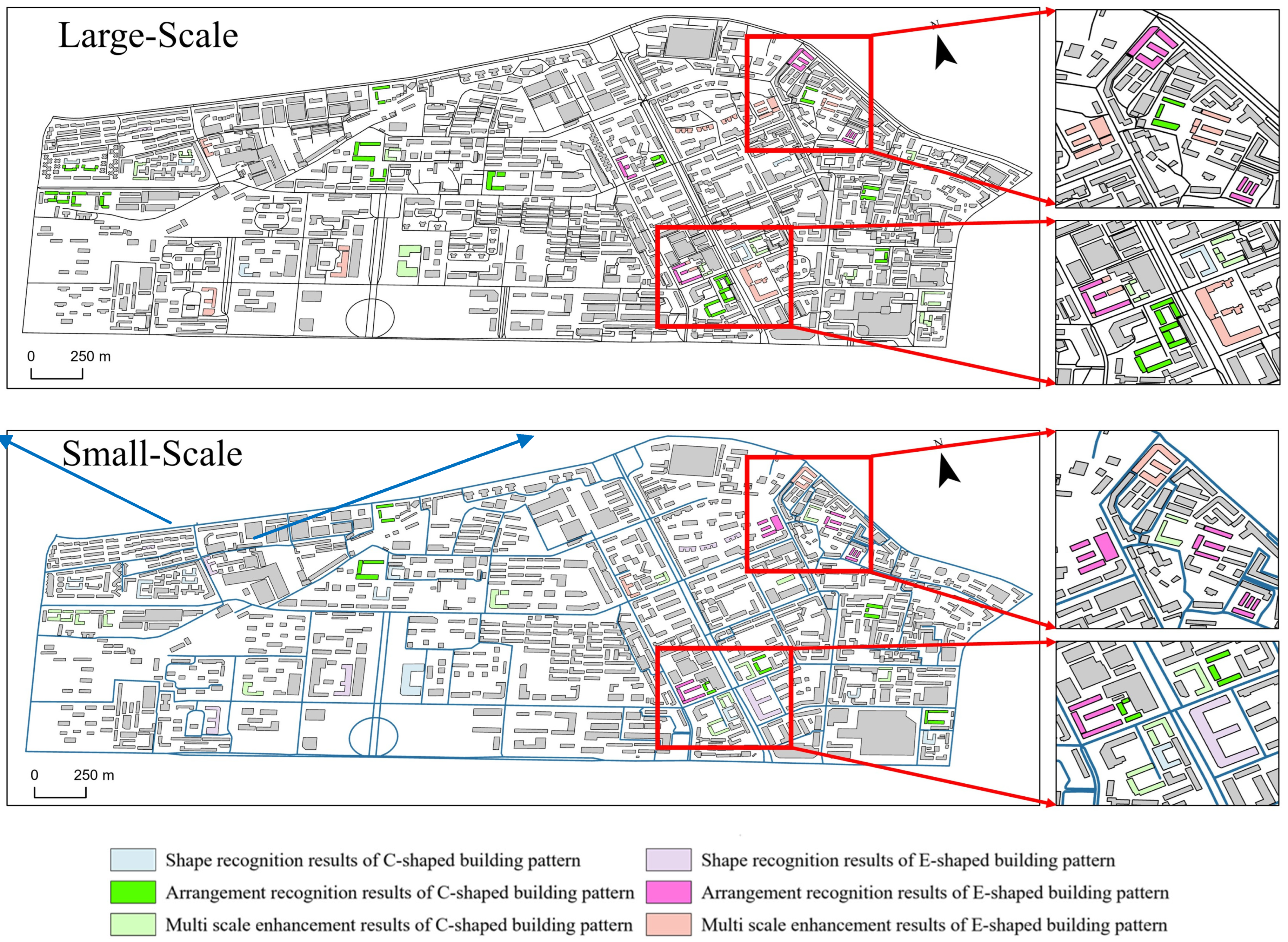The second approach involves scaling from smaller to larger scales, whereby a building group at a smaller scale is considered as an aggregation of corresponding larger-scale structures. If a group of buildings is identified with an I-shaped pattern at a smaller scale, it suggests that the associated group at a larger scale might also exhibit an I-shaped pattern [