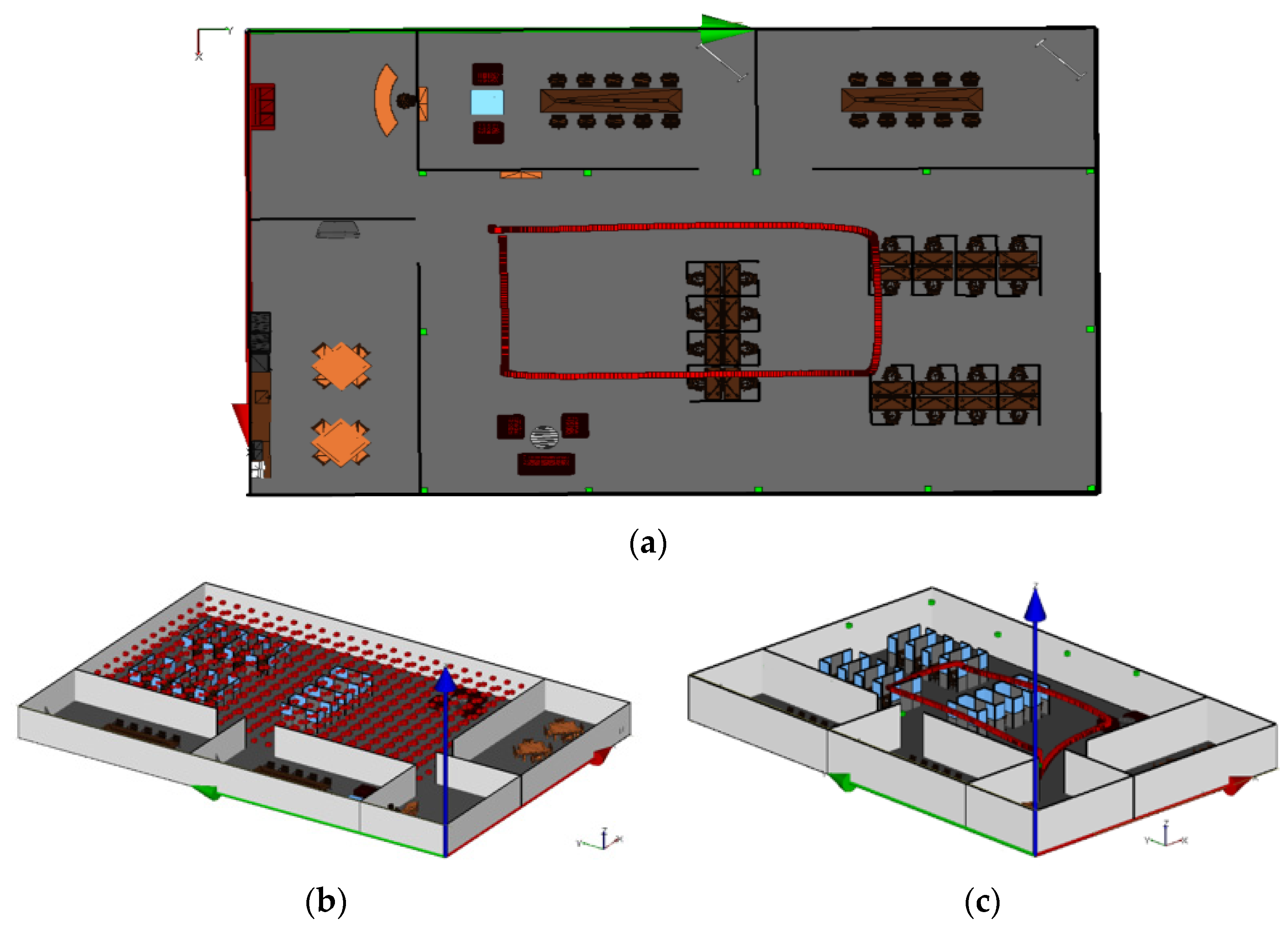 Figure 3a,c. For improved visualization clarity, the ceiling of the simulated environment is hidden in