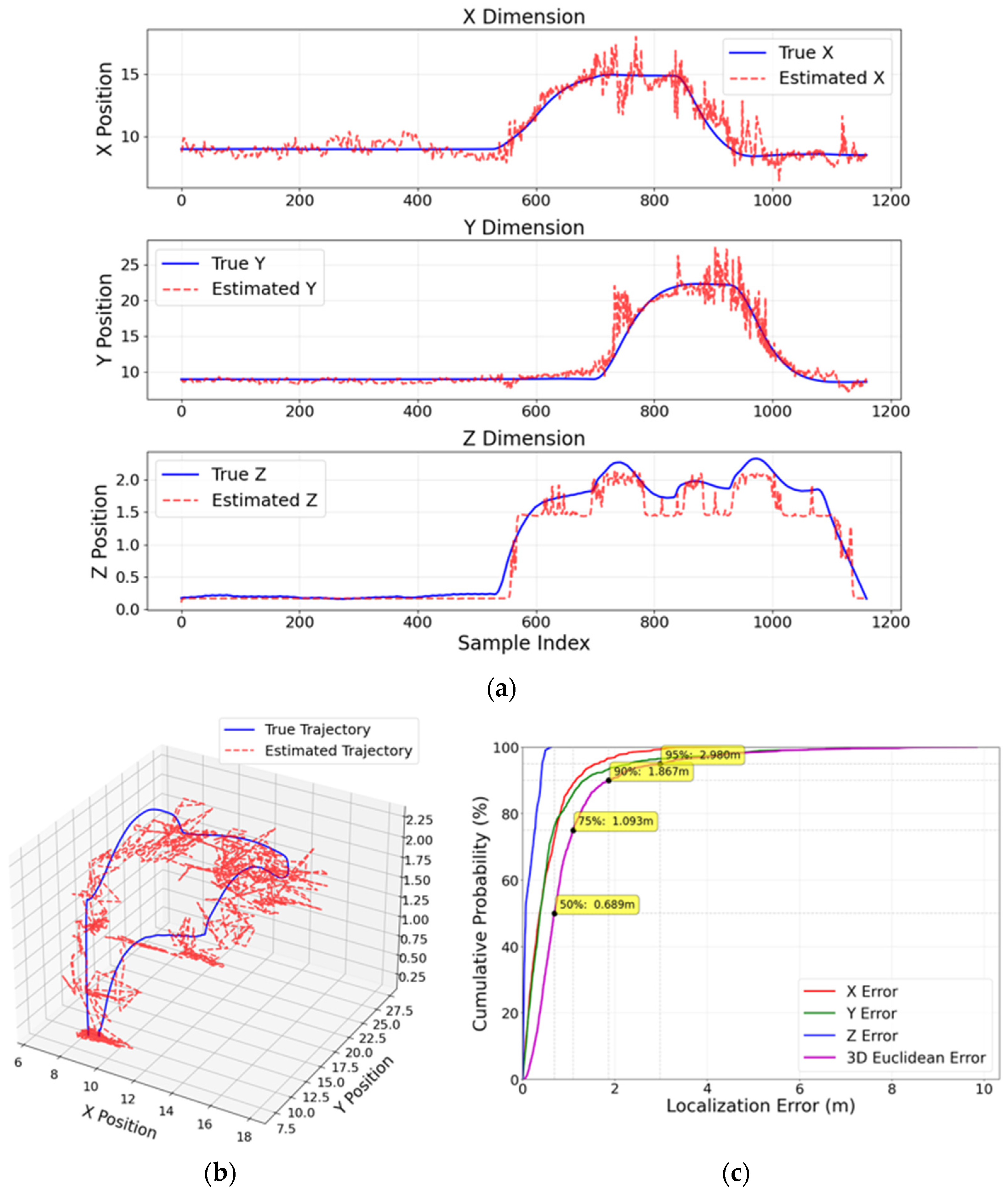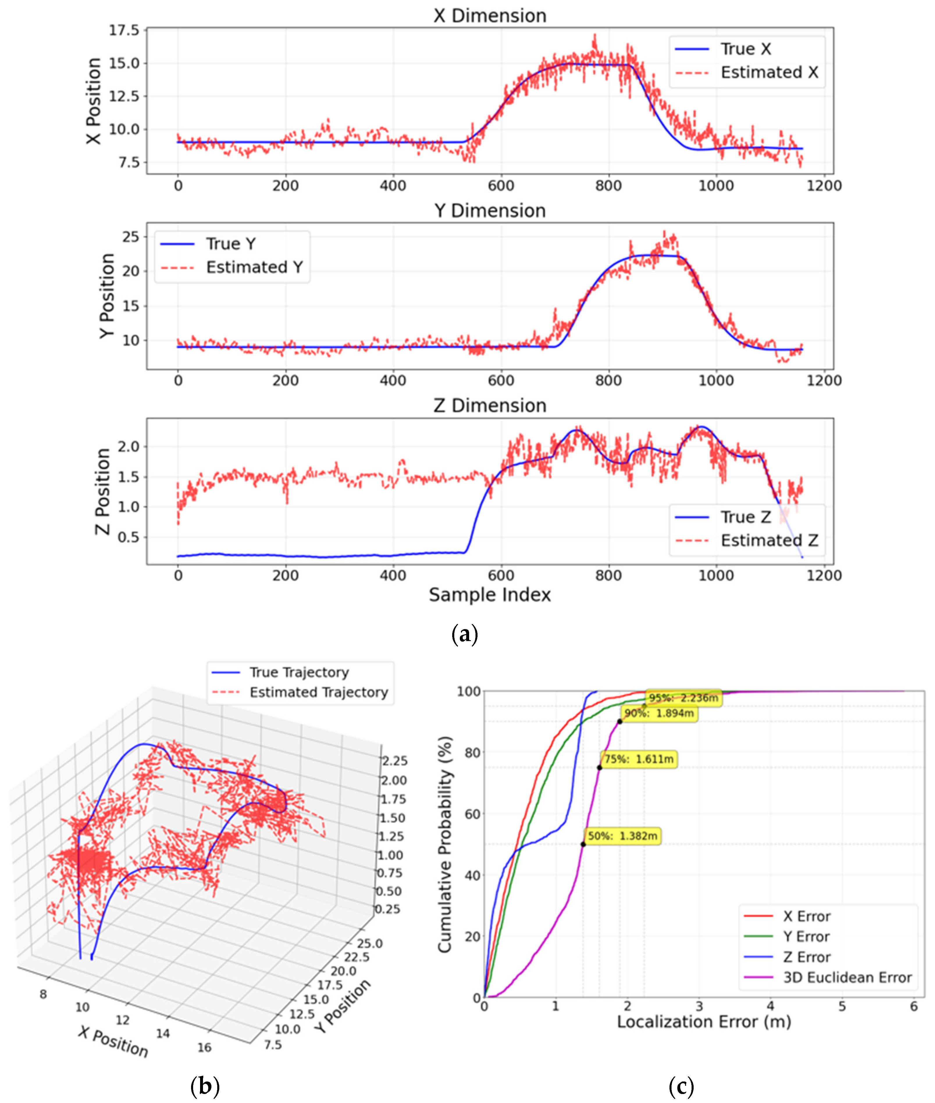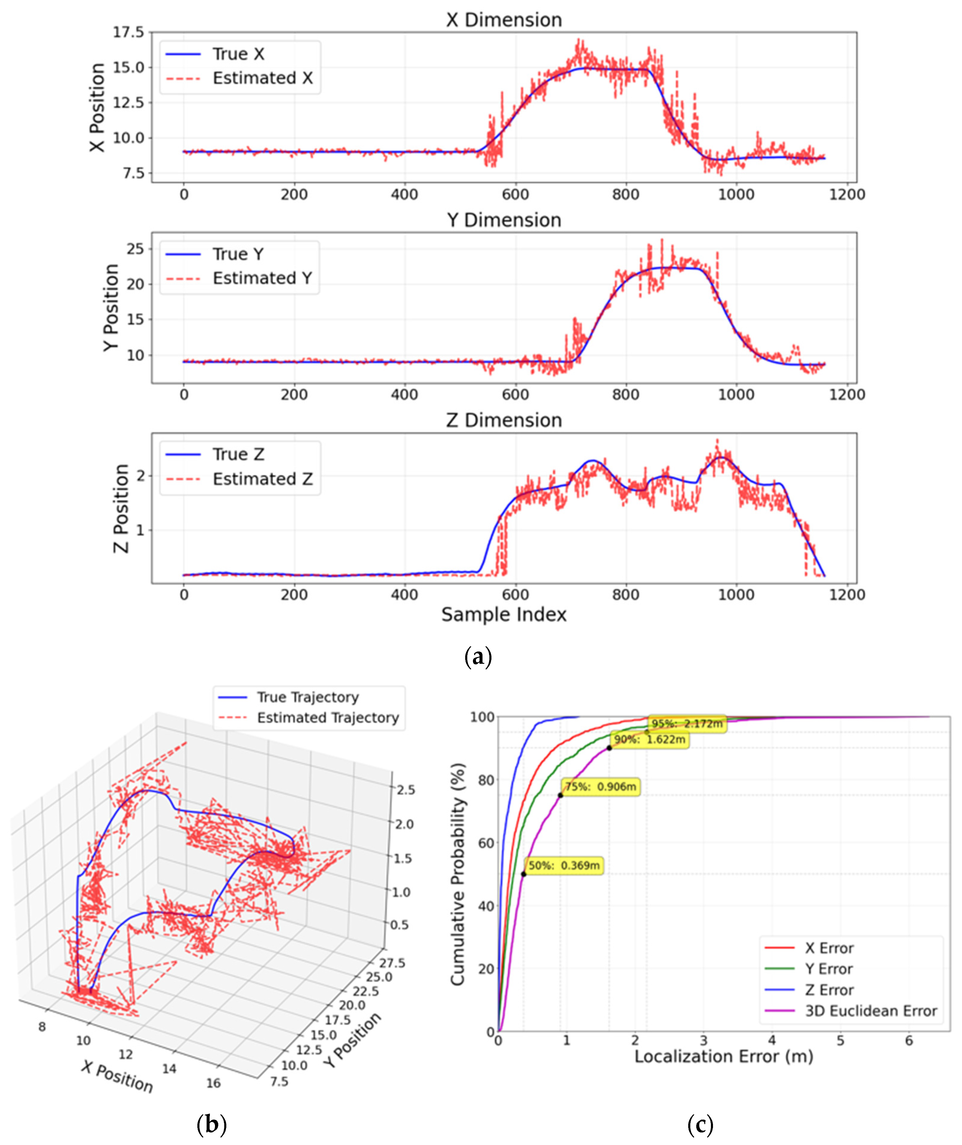 Furthermore, CDFs of the positioning error are presented to illustrate the statistical distribution of localization accuracy and to provide percentile-based performance insights (e.g., median and 90th-percentile errors).
