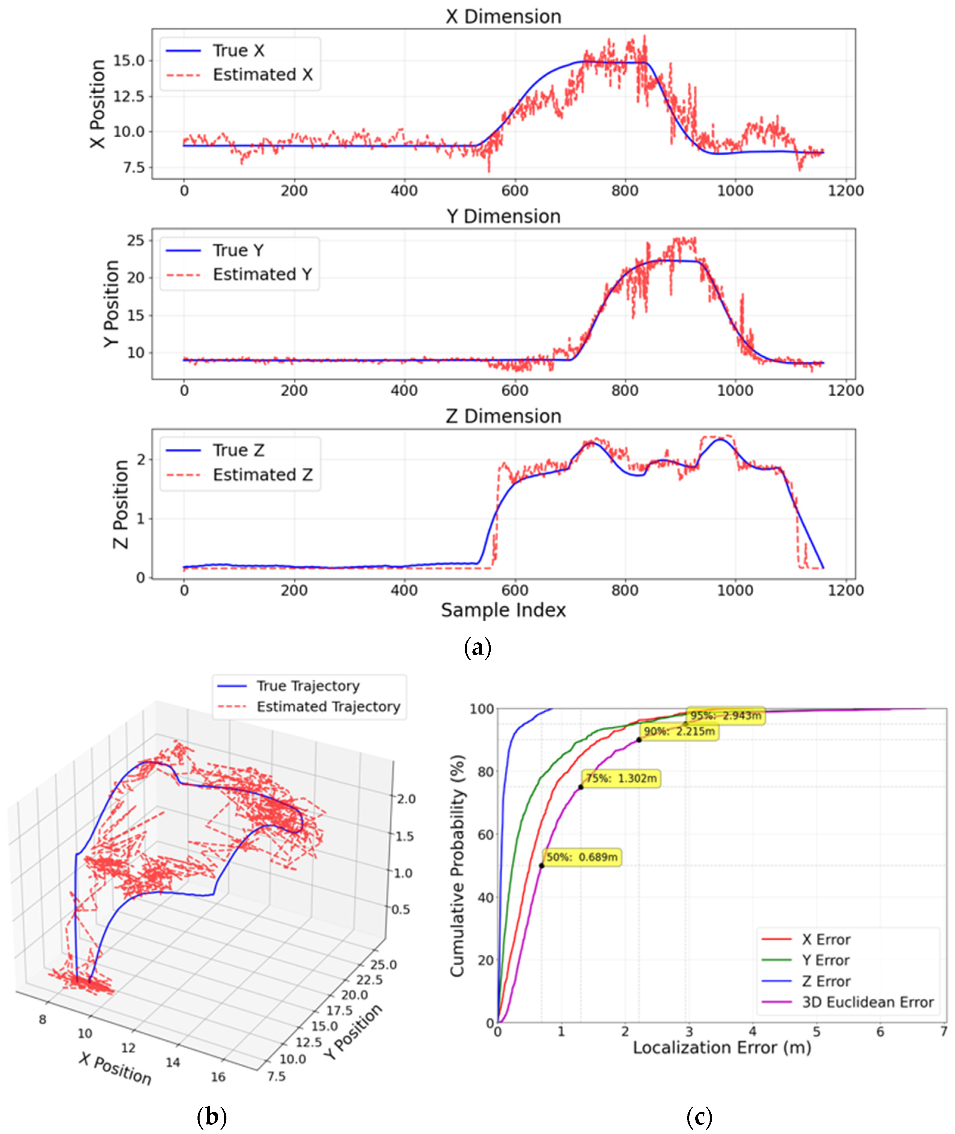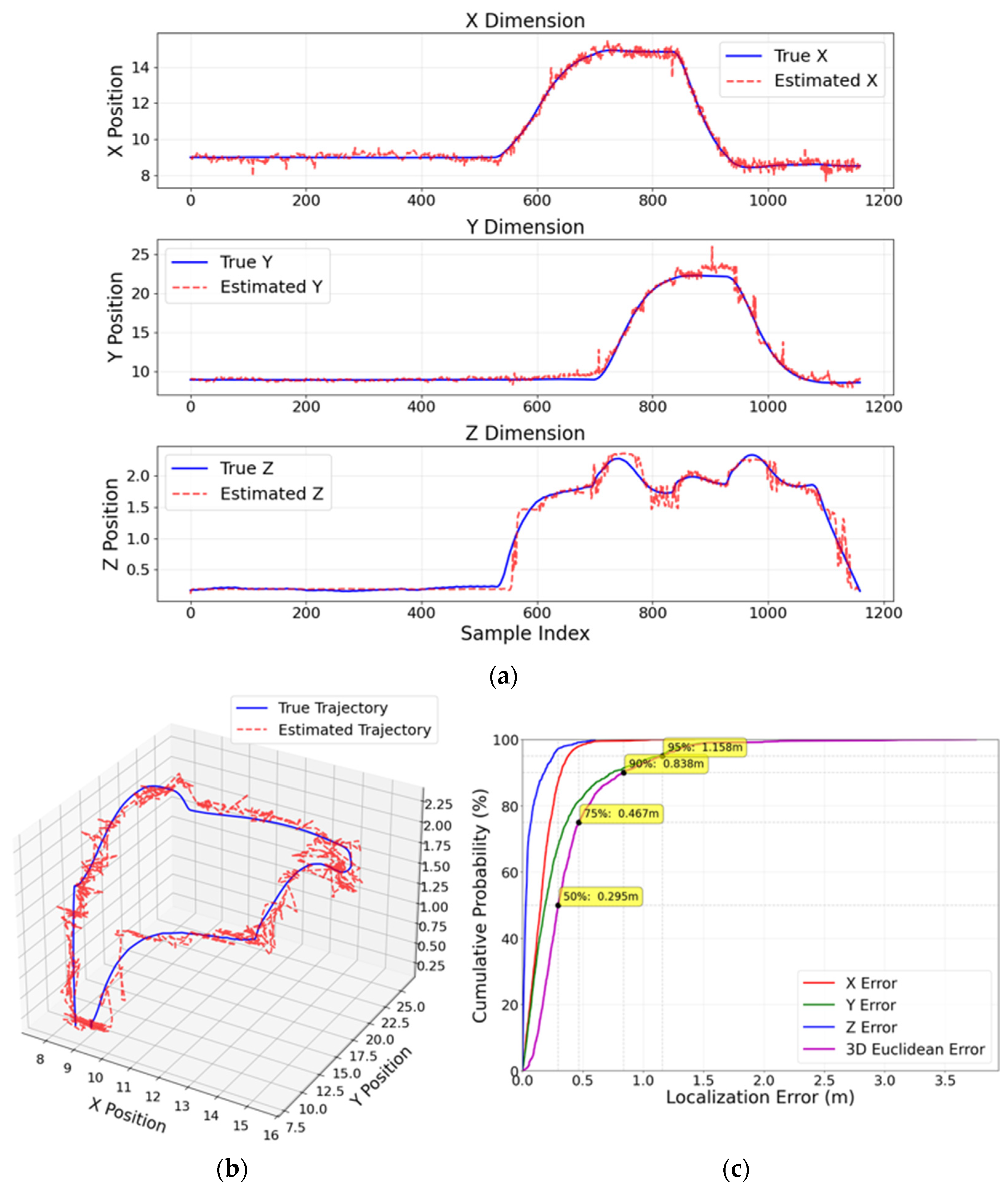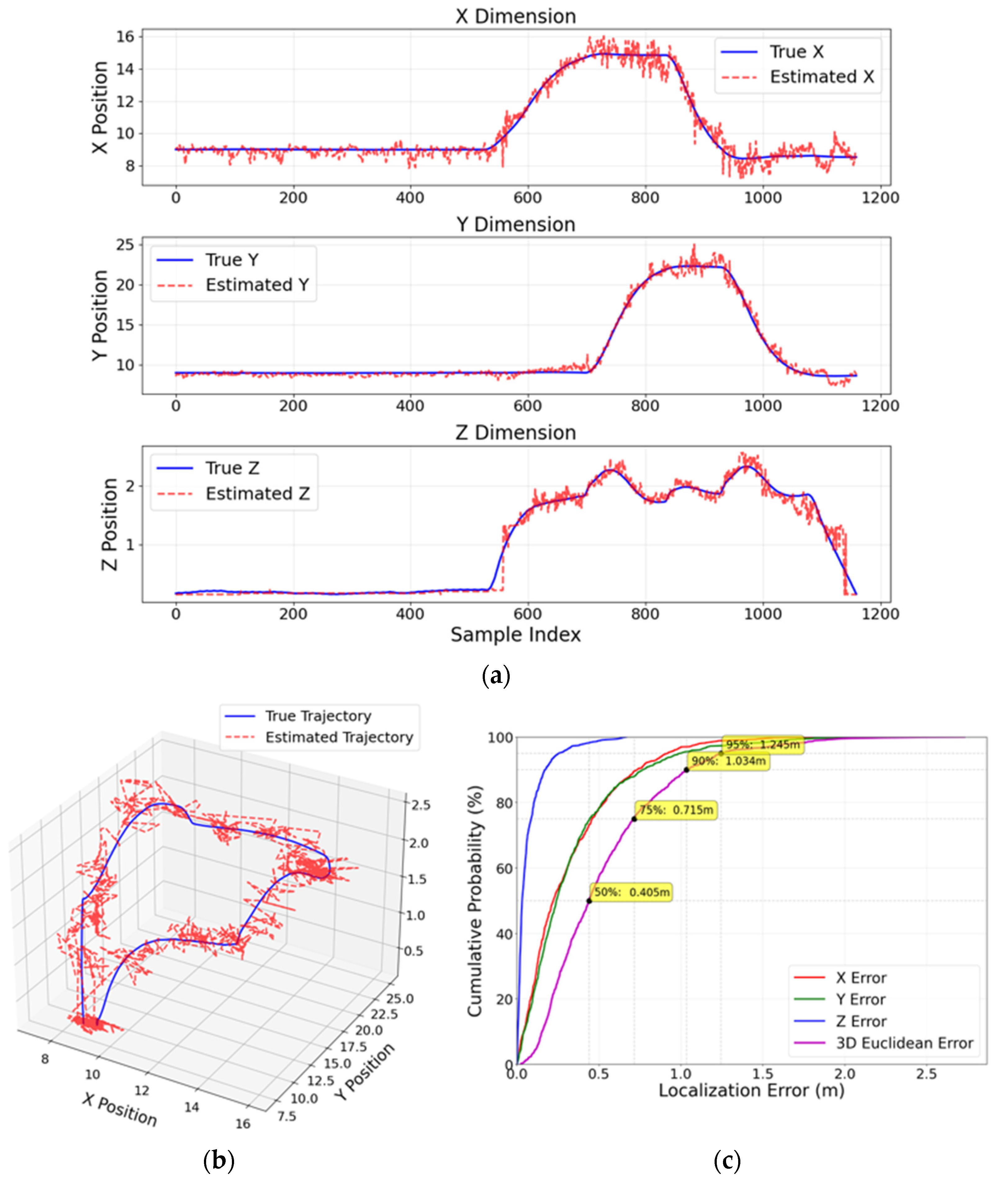 Furthermore, CDFs of the positioning error are presented to illustrate the statistical distribution of localization accuracy and to provide percentile-based performance insights (e.g., median and 90th-percentile errors).