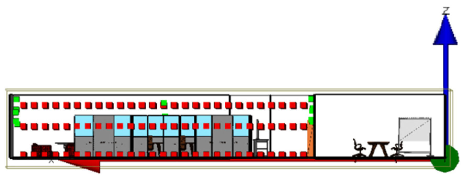 Figure 3a. Within this structure, twelve transmitters (TXs), represented by green cubes, were strategically positioned at heights ranging from 1.7 m to 2.8 m above the floor. To train the DCNN model, three horizontal plates of receivers (RXs), represented by red cubes, were positioned at heights of 0.15 m, 1.5 m, and 2.5 m above the floor, as depicted in
