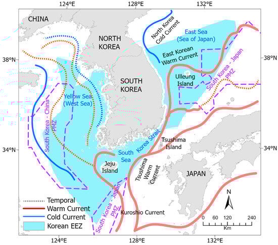 The Exclusive Economic Zone of the Republic of Korea (Republic of Korea) [20] covers parts of the Yellow Sea, the East China Sea, and the East Sea (Sea of Japan). Figure 1 shows the EEZ, buffered 10 km from coastlines, together with warm and cold currents and the Provisional Measure Zones (PMZs). PMZs represent joint fishing areas established between South Korea and neighboring countries. One PMZ in the Yellow Sea is shared with China, while the PMZs in the East China Sea and the East Sea are jointly shared with Japan. The Yellow Sea is shallow (less than 80 m deep) with wide continental shelves, while the East Sea has deep basins that exceed 2000 m [21]. The EEZ is influenced by several ocean current systems. The Kuroshio Current extends into the East China Sea, the Tsushima Warm Current enters the East Sea, and the North Korea Cold Current flows southward along the east coast [21]. The interaction of these currents produces seasonal fronts and stratification. Hydrographic conditions change with season and affect primary productivity. The total area of the Korean EEZ is about 349,609 km2.