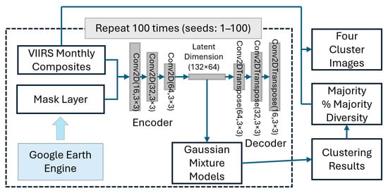 A convolutional autoencoder (CAE) framework (Figure 2) was implemented to identify spatiotemporal similarity patterns among monthly VIIRS DNB composite images. In contrast to convolutional neural network (CNN) methods that are primarily used for object detection and classification in images [31], the convolutional autoencoder is an unsupervised learning model designed to discover underlying patterns in images through multilevel feature extraction. The CAE is a variant of the autoencoder that employs convolutional layers, which makes it more suitable for processing 2D data with spatial patterns compared with conventional autoencoders [32,33]. Recently, CAE has been applied to various satellite imagery and time-series image analysis tasks, leveraging spatiotemporal features to compress high-dimensional image data into informative latent representations [34,35].