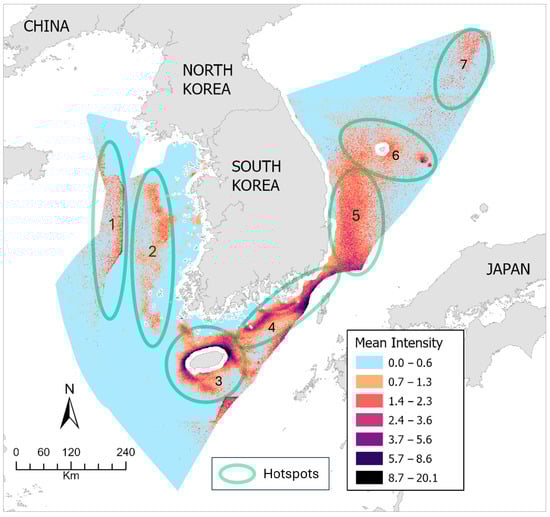 The intensities of nighttime lights were obtained by calculating mean values from the original 132 monthly composite images in the 500 m grid. The resulting map (Figure 3) illustrates the spatial distribution of nighttime lights observed by VIIRS DNB. The highest concentrations of nightlight activity are distinctly visible around Jeju Island, extending eastward through the Korea Strait, suggesting sustained and concentrated fishing operations in these southern coastal waters. Intense light emissions are also evident in the South Korea–China PMZ in the Yellow Sea and the South Korea–Japan PMZ in the East China Sea. A northward linear patch also appears in the Yellow Sea between the Korean Peninsula and the South Korea–China PMZ. Along the eastern coast of the Korean Peninsula, nightlight intensities appear more dispersed, extending offshore toward the west-side of Ulleung Island. Patches also appear around Ulleung and Dokdo Islands, and at the far northeastern corner of the Korean EEZ where the Yamato Rise provides optimal habitat for multiple fish species. In total, about seven hotspots are identified: (1) South Korea–China PMZ, (2) linear and northward stretch at the Yellow Sea, (3) around Jeju Island, (4) South Sea stretch from Jeju Island through the Korea Strait, (5) wide and linear northward stretch along the east coast of the Korean peninsula, (6) around the Ulleung and the Dokdo Islands, and (7) the northeast corner of the Korean EEZ. Overall, the light intensity map captures clear geographical hotspots and gradients in fishing intensity, strongest in the South Sea and tapering northward into the Yellow and East Seas.