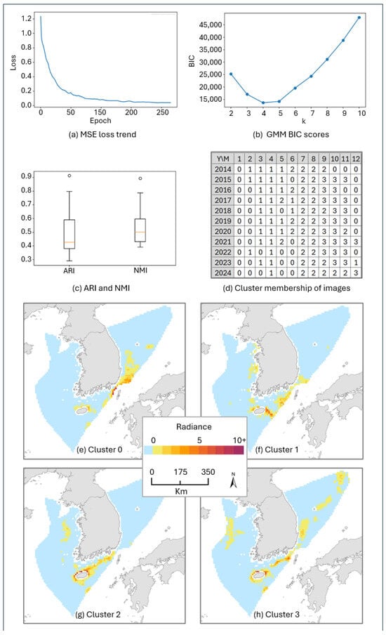 The four clusters revealed by the CAE–GMM correspond closely to seasonal fisheries cycles and regulatory constraints in the Korean EEZ and PMZs. Specifically, Cluster 2 (summer) exhibits low activity in the South Korea–China PMZ, whereas Cluster 3 (autumn) shows intensified illumination in the same region. This shift aligns with China’s closed fishing season, which generally spans May–August. In South Korea, fishing vessel lights would also be affected by the fishing off-seasons. In 2024, for example, off-season species include Blue Crab (Portunus trituberculatus, 21 June–20 August), Japanese flying squid (Todarodes pacificus, 1 April–30 May), Spanish mackerel (Scomberomorus niphonius, 1 May–30 May), and mackerel (Scomber japonicus, one month in April–June). During these months, reduced activity in Cluster 2 likely reflects regulatory enforcement. The subsequent surge of activity in Cluster 3 (September–November) represents the resumption of fishing efforts following the closed seasons, highlighting the interplay between policy-driven temporal restrictions and observed satellite light patterns.