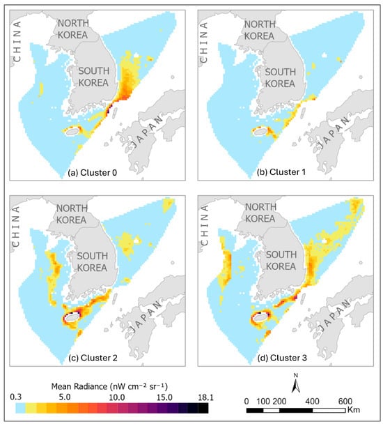 Figure 5 illustrates the four representative cluster patterns (Clusters 0–3), each derived from the mean radiance composites corresponding to their respective mode-defined clusters. Cluster 1 exhibits the lowest nightlight intensity among the four (range = 0.16–6.96, mean = 0.35), with sparse fishing activities concentrated around Jeju Island and along the EEZ boundary with Japan in the South Sea. Cluster 2 presents a higher level of illumination (range = 0.19–17.43, mean = 0.74), primarily distributed from Jeju Island through the Korea Strait, indicating intensified fishing activity. Light patches also appear in both the Yellow Sea and East Sea, though their brightness remains lower compared to the Jeju–Korea Strait corridor. Interestingly, little lights appear at the South Korea–China PMZ, the joint fishing area between Korea and China, in the Yellow Sea. Cluster 3 represents the most extensive and intense nightlight pattern (range = 0.27–18.17, mean = 0.93). While the South Sea retains a pattern similar to Cluster 2, the spatial extent slightly contracts. In contrast, the East Sea exhibits widespread illumination stretching from Busan to Ulleung Island and reaching the northeastern corner of the Korean EEZ, while in the Yellow Sea, light activities concentrate at the South Korea–China PMZ. Finally, Cluster 0 (range = 0.18–15.07, mean = 0.64) shows weak and scattered light presence around Jeju Island and the Yellow Sea, yet a broad, continuous concentration appears along the Tsushima–Ulleung corridor. Quantitatively, Cluster 3 recorded the highest mean radiance, followed by Cluster 2 and Cluster 0, with Cluster 1 exhibiting the lowest intensity. This distinct minimum in Cluster 1 aligns with its temporal dominance in early spring, a period typically associated with reduced fishing effort.