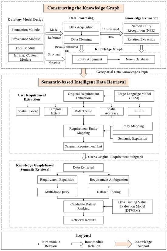 Overall, the clear professional boundaries and unique semantic characteristics of geospatial data have resulted in a lack of knowledge graphs derived from large-scale datasets and applicable construction methods. With regard to data retrieval, technologies including ontologies and latent semantic analysis have been integrated. However, these methods still depend on predefined thesauri for semantic expansion. Their retrieval performance is constrained by the scale and quality of the thesaurus. They often focus on single feature dimensions. Therefore, they lack multi-dimensional analysis capabilities, which make them unsuitable for complex requirement semantics confronted in data trading scenarios. As a result, these methods are inappropriate for users lacking professional domain knowledge in data trading.
