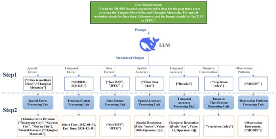 This study used the DeepSeek-V3 model and a few-shot prompting design method to initially decompose user requirements [24]. The Chinese semantic understanding capability of this model ranks among the leading contemporary LLMs, which enables it to effectively comprehend and follow prompts to produce structured outputs [25]. The few-shot prompting method involves embedding multiple input–output demonstration cases within the prompt to enhance the understanding of the task by the model while effectively constraining its output format. The user requirement text is first input into the LLM, which is then guided to perform a preliminary decomposition and extraction of the requirements. Ultimately, a structured list of extracted results for seven types of requirement aspects, namely, Spatial Extent, Temporal Extent, Data Format, Spatial Accuracy, Temporal Accuracy, Data Theme, and Observation System, is generated [26]. Table 1 displays the prompt example for the first stage of the LLM.