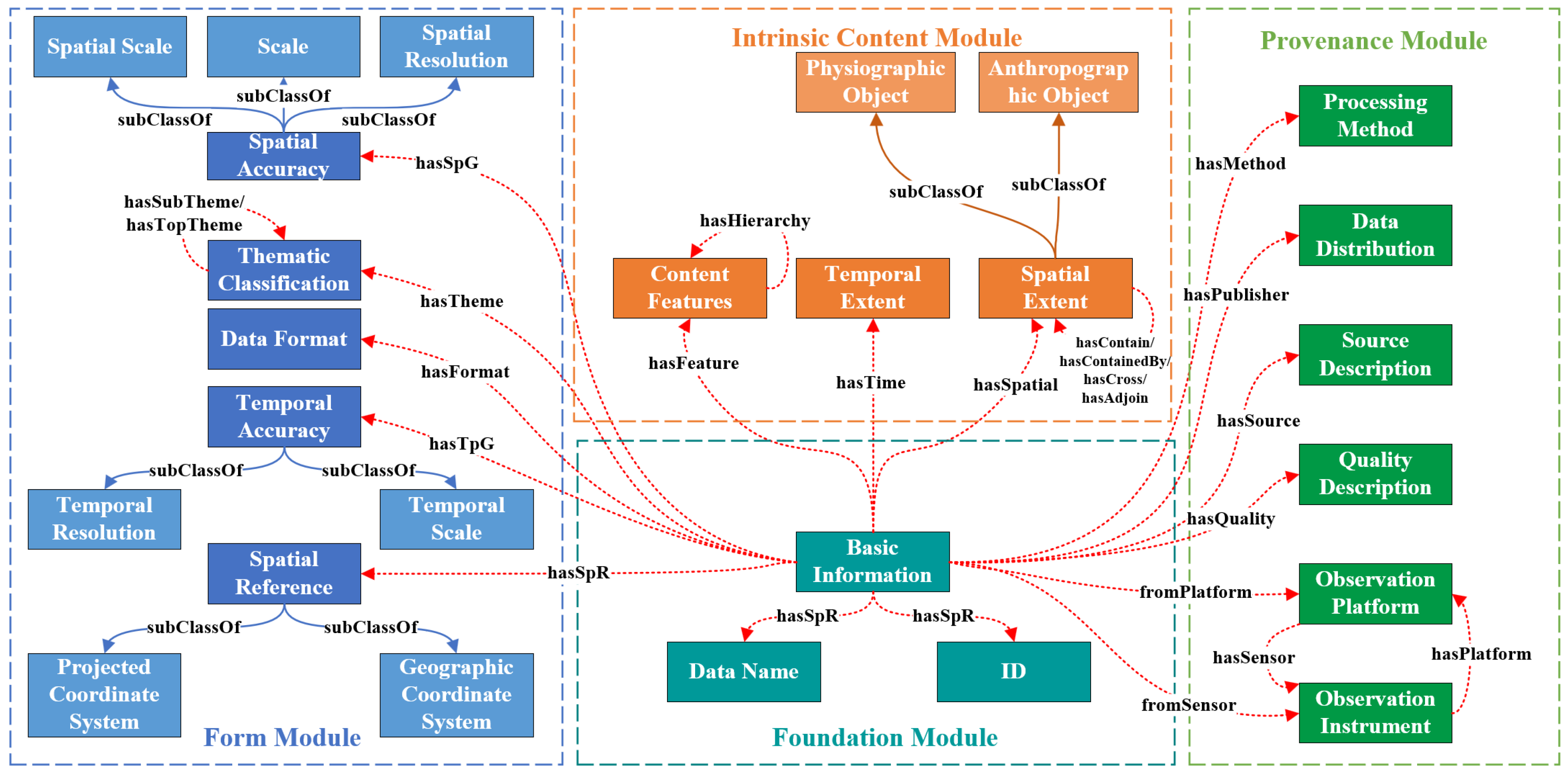 - The Provenance Module includes the Data Publisher class, Processing Method class, Source Description class, Quality Description class, Observation Platform class, and Observation Instrument class. This module describes information related to the production process of the data resource. Users often heavily consider this information when choosing data; for instance, they may prefer authoritative data published by national units when choosing administrative division data, or seek data resources processed from raw data, such as local statistical yearbooks when searching for economic development data related to a specific location.