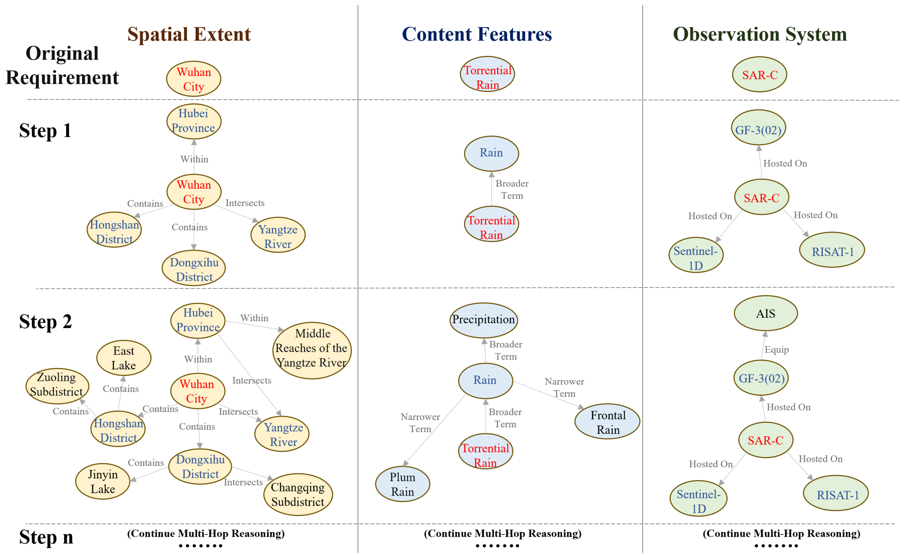 - Based on this subgraph, the “Basic Information” entities and all their directly connected entities within the geospatial data knowledge graph are queried. This step aims to acquire the sets of geospatial data that correspond to the expanded “Spatial Extent,” “Data Theme,” and “Observation System” requirements.