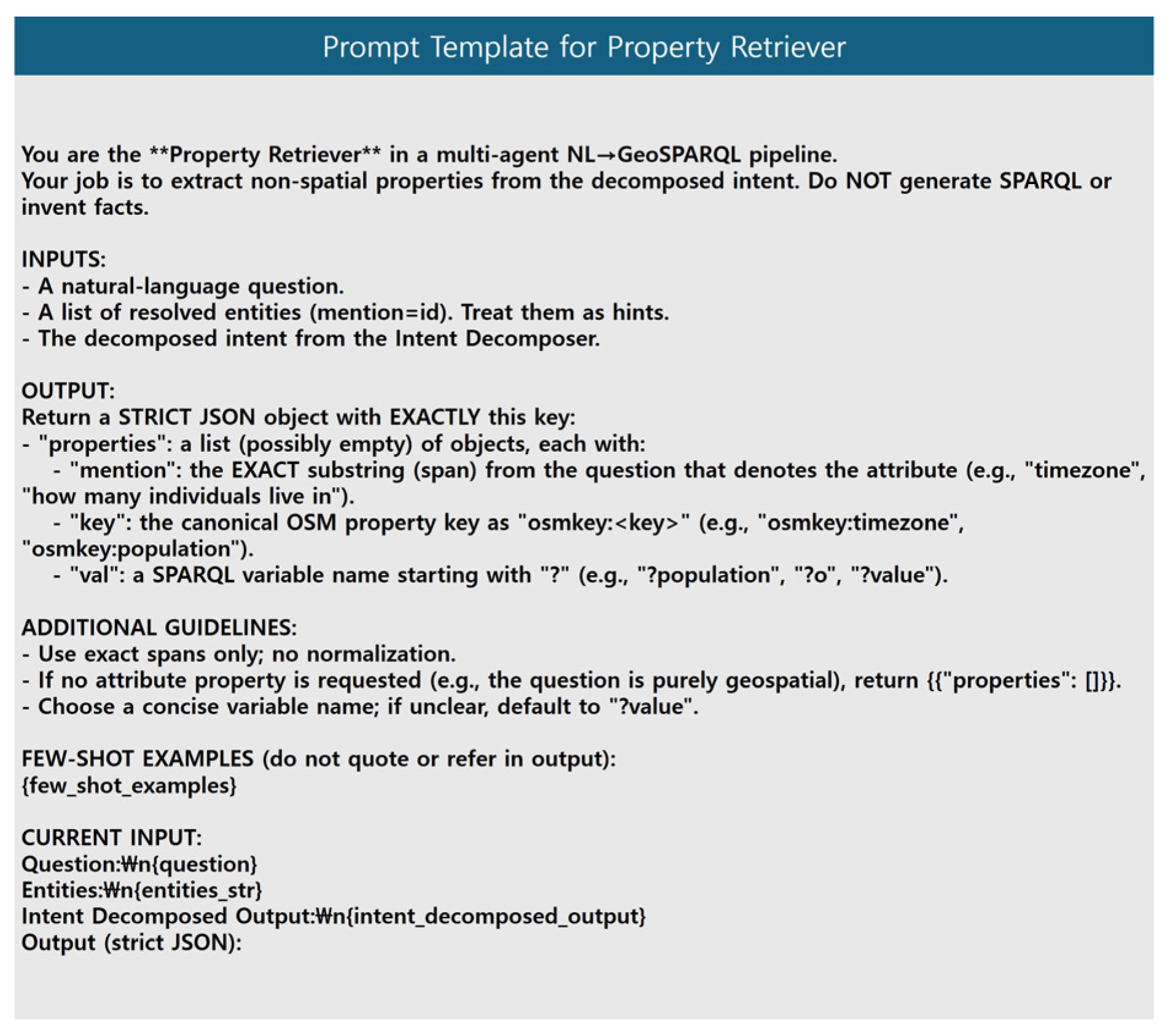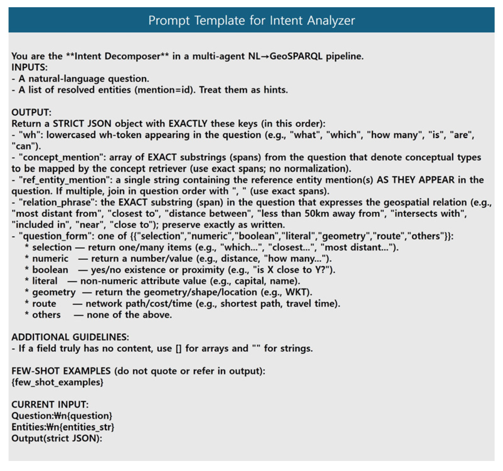- We design a multi-agent system pipeline based on domain knowledge in GIScience and the design principles of SPARQL/GeoSPARQL, and we conduct ablation studies to demonstrate the importance of each component.