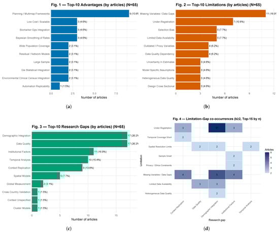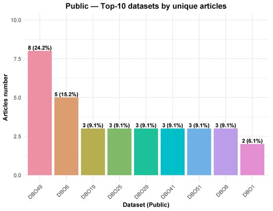 Beyond the qualitative characterization of the most frequently used datasets, the systematic mapping quantified the distribution of public data sources across the 65 included articles. Figure 1 summarizes the top-10 public datasets by number of unique articles. The distribution is dominated by large-scale demographic survey data from the DHS Program (DB049), which accounts for 24.2% of the studies, followed by DB06 with 15.2%. A second group of public datasets—including DB019, DB025, DB029, DB041, DB051, and DB08—each contributes approximately 9.1% of the articles, while DB01 represents 6.1%. This distribution highlights the central role of nationally and internationally harmonized survey and census-related datasets in GIS-based research on public health and urban security, reflecting both their accessibility and their suitability for comparative and reproducible spatial analyses.