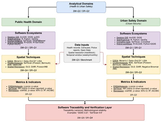Conceptual GIS integration framework illustrating a schematic taxonomy linking software ecosystems, analytical domains (health and urban safety), and spatial techniques. The framework supports reproducibility verification (Section 3.4) and the quantitative synthesis of technological ecosystems (Section 4.2.3).