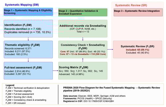 The preregistration includes the complete methodological protocol, search strings, literal PICOS/SPICE inclusion and exclusion criteria (Table 4, Table 5 and Table 6), and the PRISMA flow diagram adapted to the fused SM→SR pipeline. This registration ensures full traceability, transparency, and reproducibility of the process in compliance with Open Science principles.