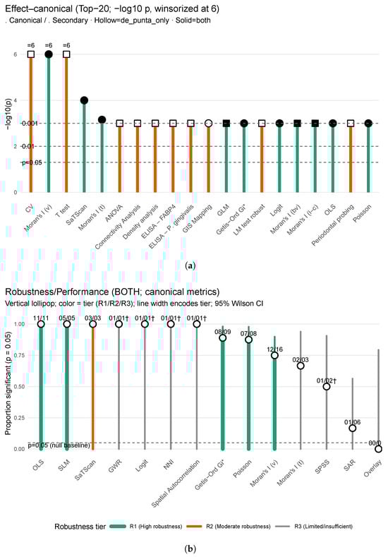Overall, this technological benchmark consolidates a descriptive foundation for understanding how GIS environments, computational tools, and spatial methodologies converge across domains. By clarifying these associations, it provides the conceptual groundwork for assessing reproducibility and methodological consistency in subsequent sections of this study. Importantly, this benchmark also establishes the structural context for the inferential analyses developed in Section 4.2.4, where the spatial techniques identified here (e.g., Moran’s I, Getis–Ord Gi∗, SaTScan, GWR, OLS, Poisson models) are quantitatively evaluated according to their statistical significance, effect strength, and robustness tiers (Effect–canonical vs. Performance domains).