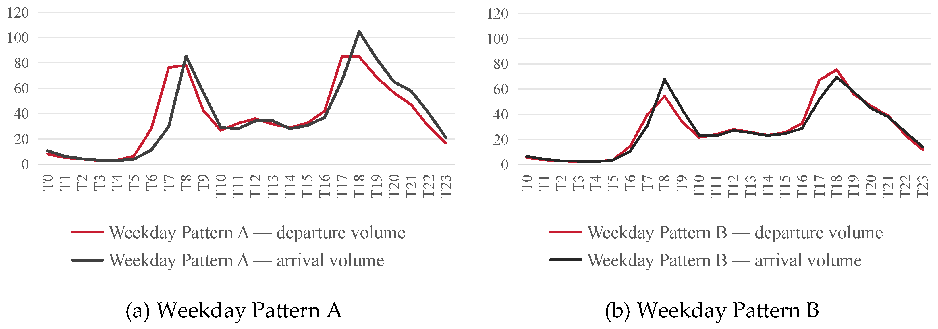 | Pattern B: Morning peak inflow | 1.32 | 0.21 (inflow, 8:00)/ 0.18 (outflow, 17:00) | 0.05 | Medium total imbalance, pronounced inflow peak at 8:00 and outflow peak at 17:00, moderate hourly fluctuation |