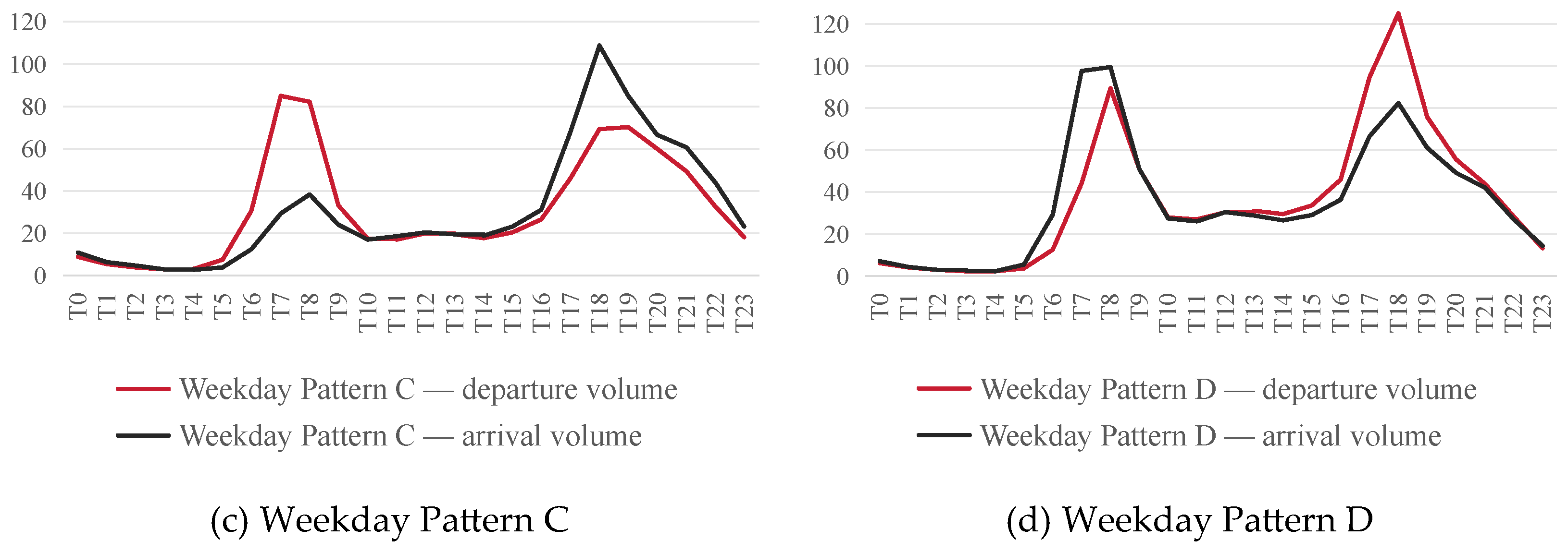 | Pattern A (Self-Sustain) | Pattern B (AM Peak Inflow) | Pattern C (AM Peak Outflow) | Pattern D (Metro-Driven Usage) | |||||