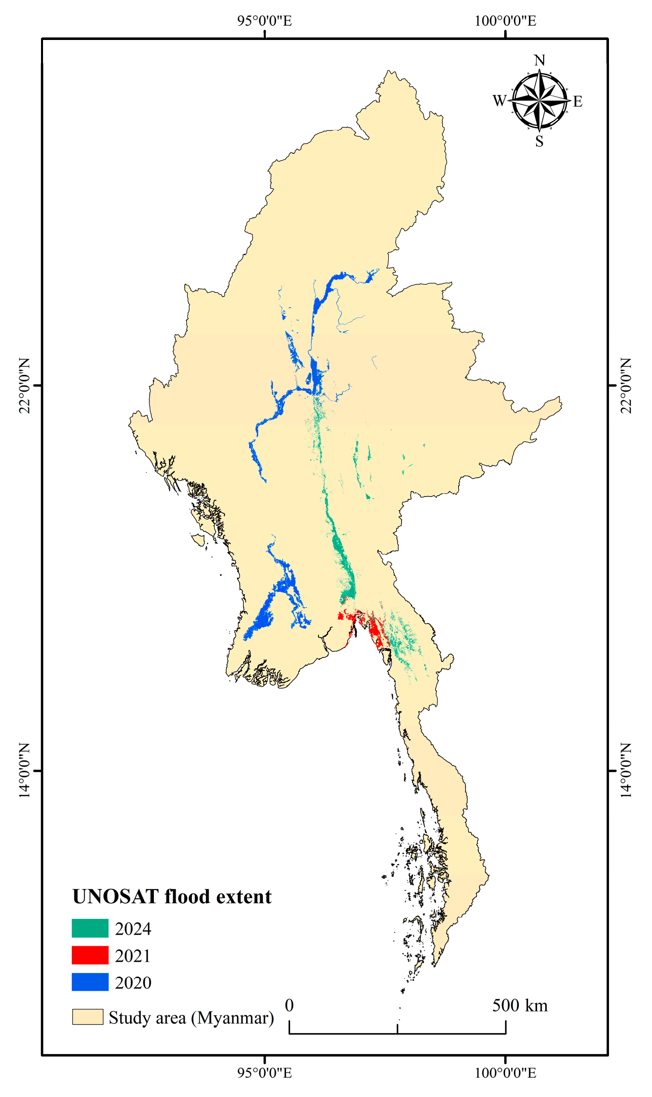 - World Bank. Myanmar Floods and Landslides: Post Disaster Needs Assessment; World Bank: Washington, DC, USA, 2016; Available online: https://www.worldbank.org/en/country/myanmar/publication/myanmar-floods-and-landslides-post-disaster-needs-assessment (accessed on 6 November 2025).