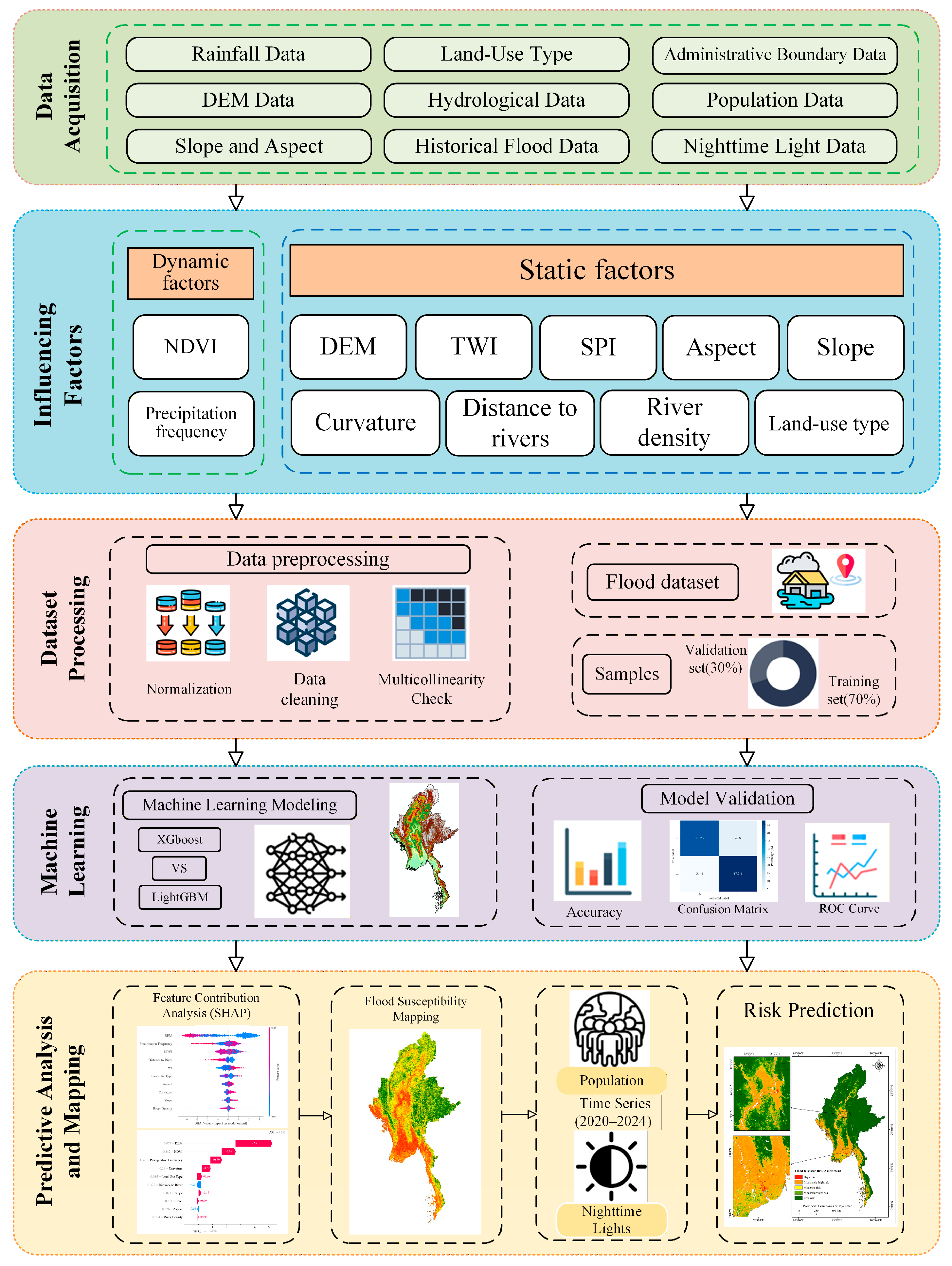 APA StyleLu, Z., Tian, Z., Zhang, H., Lu, Y., & Chen, X. (2026). Flood Susceptibility and Risk Assessment in Myanmar Using Multi-Source Remote Sensing and Interpretable Ensemble Machine Learning Model. ISPRS International Journal of Geo-Information, 15(1), 45. https://doi.org/10.3390/ijgi15010045