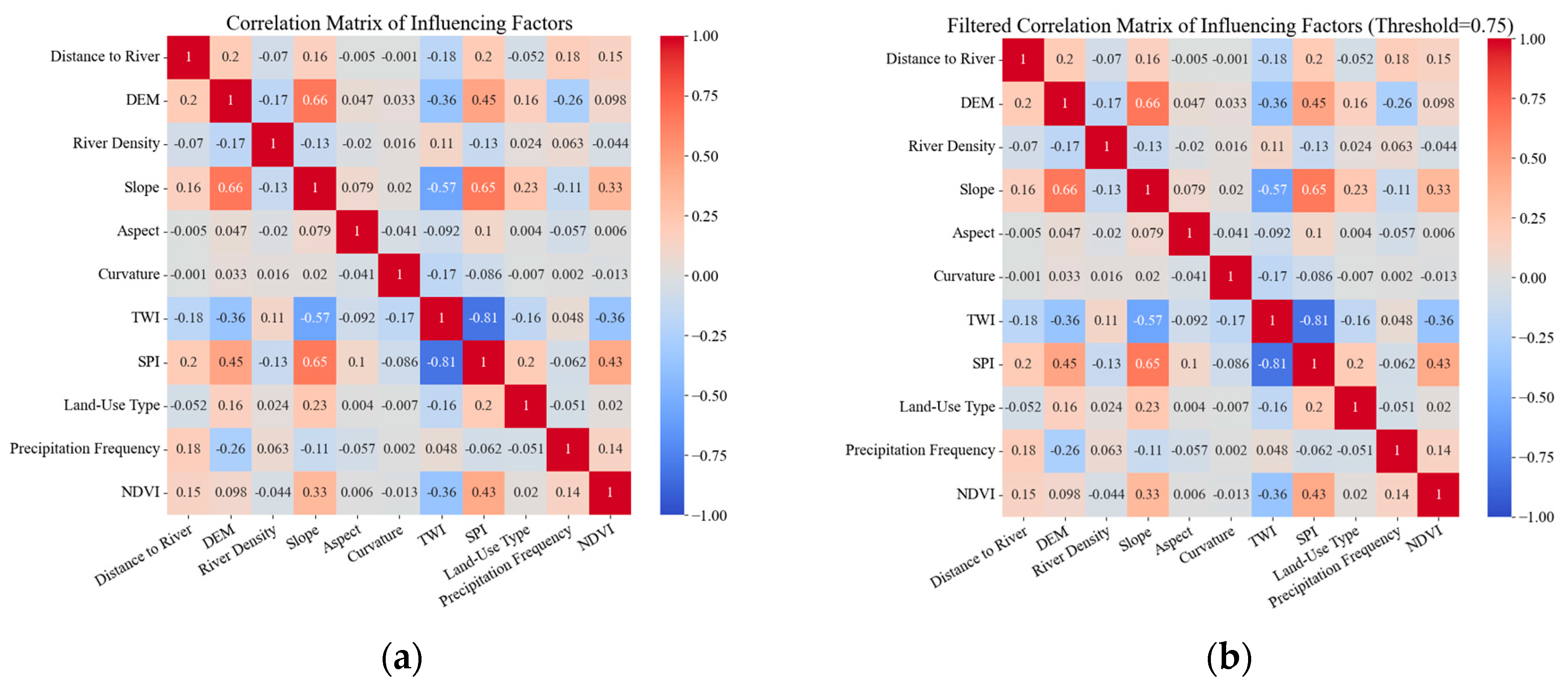 | Topographic Data | ASTER GDEM V3 (30 m) Dataset | 30 m/2020 | Extract elevation, slope, aspect, TWI, SPI factors | http://www.Gscloud.cn (accessed on 1 October 2025) |