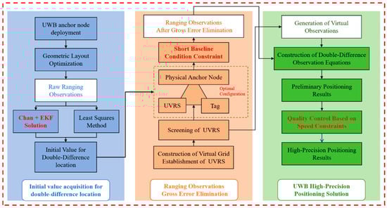 To address the three major challenges faced by UWB positioning in complex indoor environments—weak observation geometric structure, significant interference from ranging gross errors, and notable impact of systematic errors—this chapter proposes a systematic positioning method centered on UWB Virtual Reference Stations (UVRS). As illustrated in Figure 1, this method constructs a complete technical chain from data preprocessing, model solution to result post-processing, specifically encompassing the following four key links: