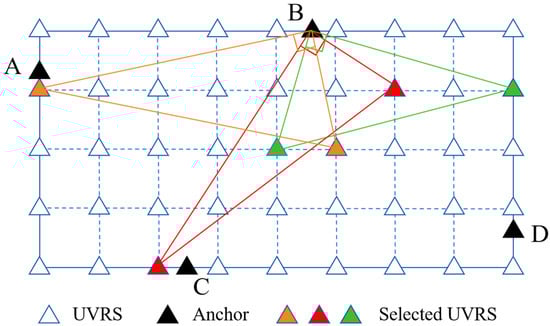 Schematic diagram of screening the optimal virtual reference station combination for physical anchor node B. Physical anchor node labels A–D.