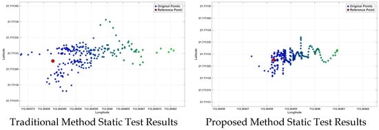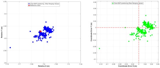 As shown in Figure 16, at a static point near the equipment area, after applying the complete method proposed in this paper, the planar Root Mean Square Error (RMSE) of the positioning results is 3.8 cm, and the average deviation from the true value is less than 1 cm. Compared with the traditional method using only raw ranging values and Chan + EKF (with an RMSE of approximately 12.5 cm), the accuracy is improved by about 70%, which proves that the double-difference model can still effectively separate errors such as hardware delay in environments where strong multipath and systematic errors coexist.