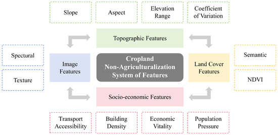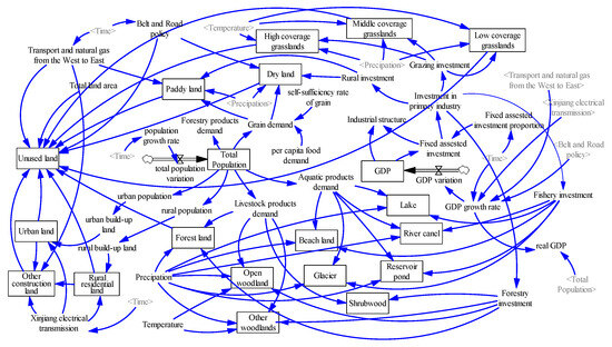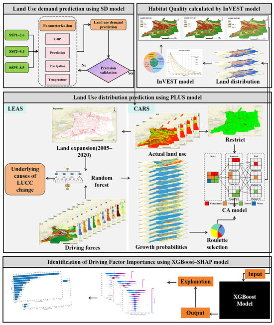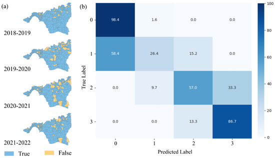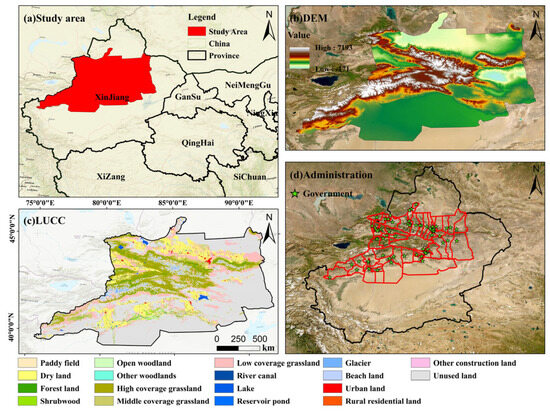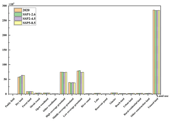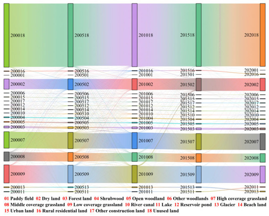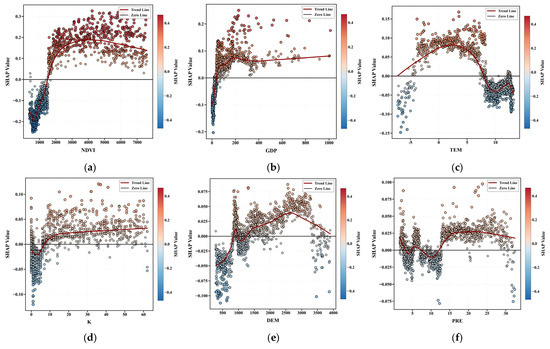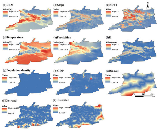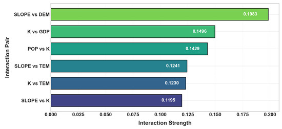 −1, respectively). (2) Land use type, soil type, and evapotranspiration were the primary single drivers of LAI spatial heterogeneity, and the interaction between land use and soil types has the most significant impact on it. (3) Climate change and human activities jointly accounted for 78.4% of the LAI variations across the study area, with the relative contribution of human activities (C