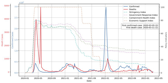 COVID-19 has had a substantial impact on NYC. According to COVID-19 data from the Center for Systems Science and Engineering at Johns Hopkins University [76] (aggregated by calendar week and shown in Figure 2), there was a high rise in COVID-19 death cases during the second quarter of 2020 and a sharp increase in confirmed cases during late 2021 and early 2022. The first confirmed cases appeared on 5 March 2020, with 2 cases reported, and the first case of death was reported on 11 March 2020. Shortly after these dates, weekly confirmed and death cases began to increase rapidly.