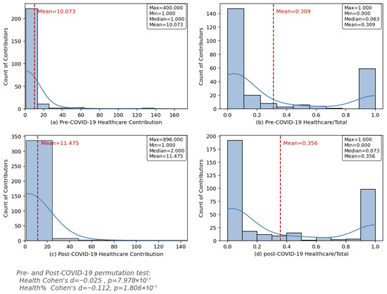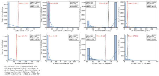 Since these metrics were computed for each contributor, histograms were generated for each metric to show their distributions. Permutation tests were conducted to compare the difference in mean values between the pre- and post-COVID-19 metrics. The permutation test also allows detection of changes in data contribution patterns while making no assumptions about the underlying distributions. In addition, Cohen’s d [91] was calculated to quantify the effect size of these changes, providing a standardized measure of the magnitude of differences in data contribution behavior between the two time periods.
