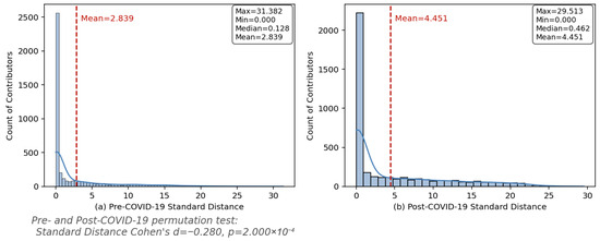 Frequency distribution of the standard distance of OSM contributors’ edits in the pre- and post-COVID-19 periods. (a) Pre-COVID standard distance; (b) post-COVID standard distance.